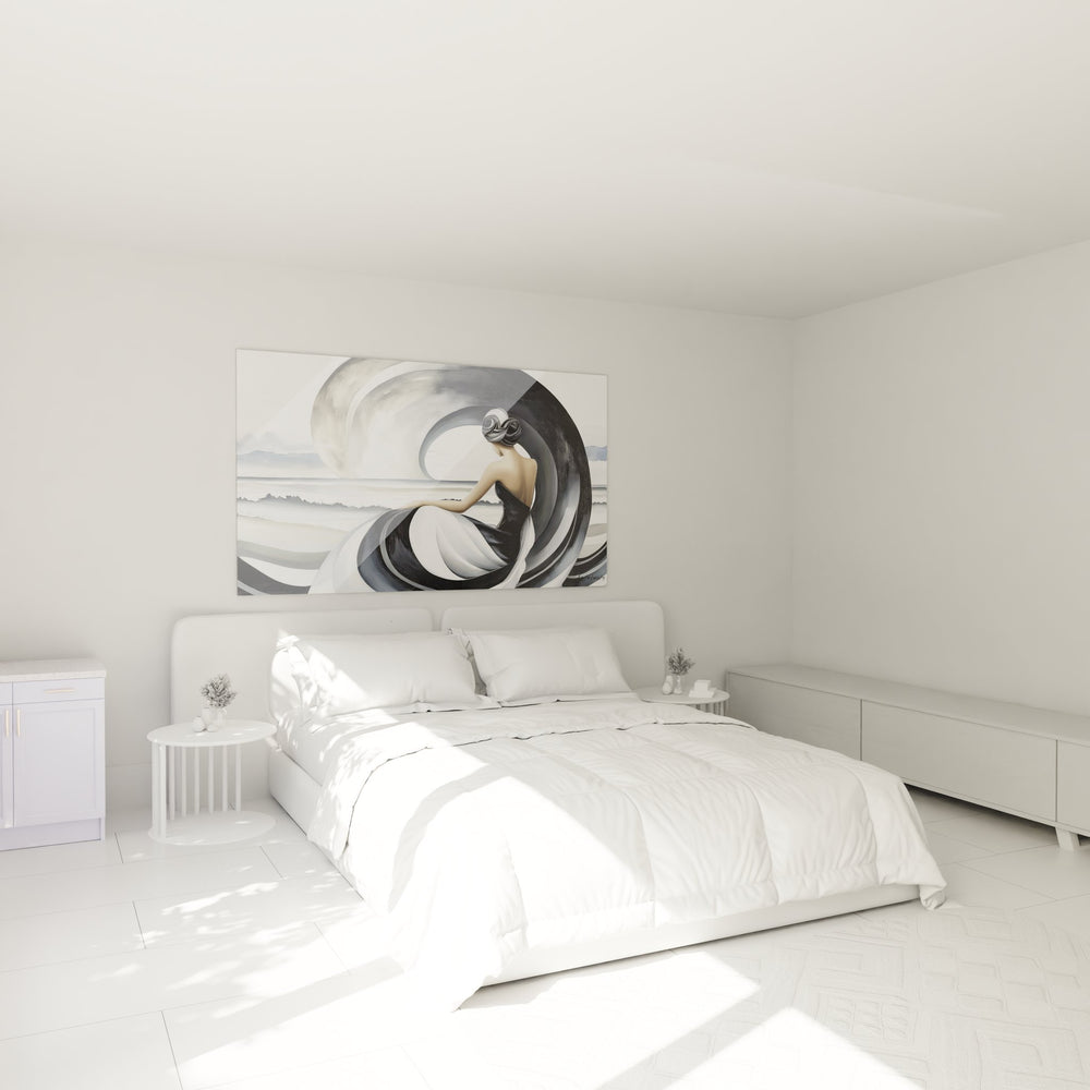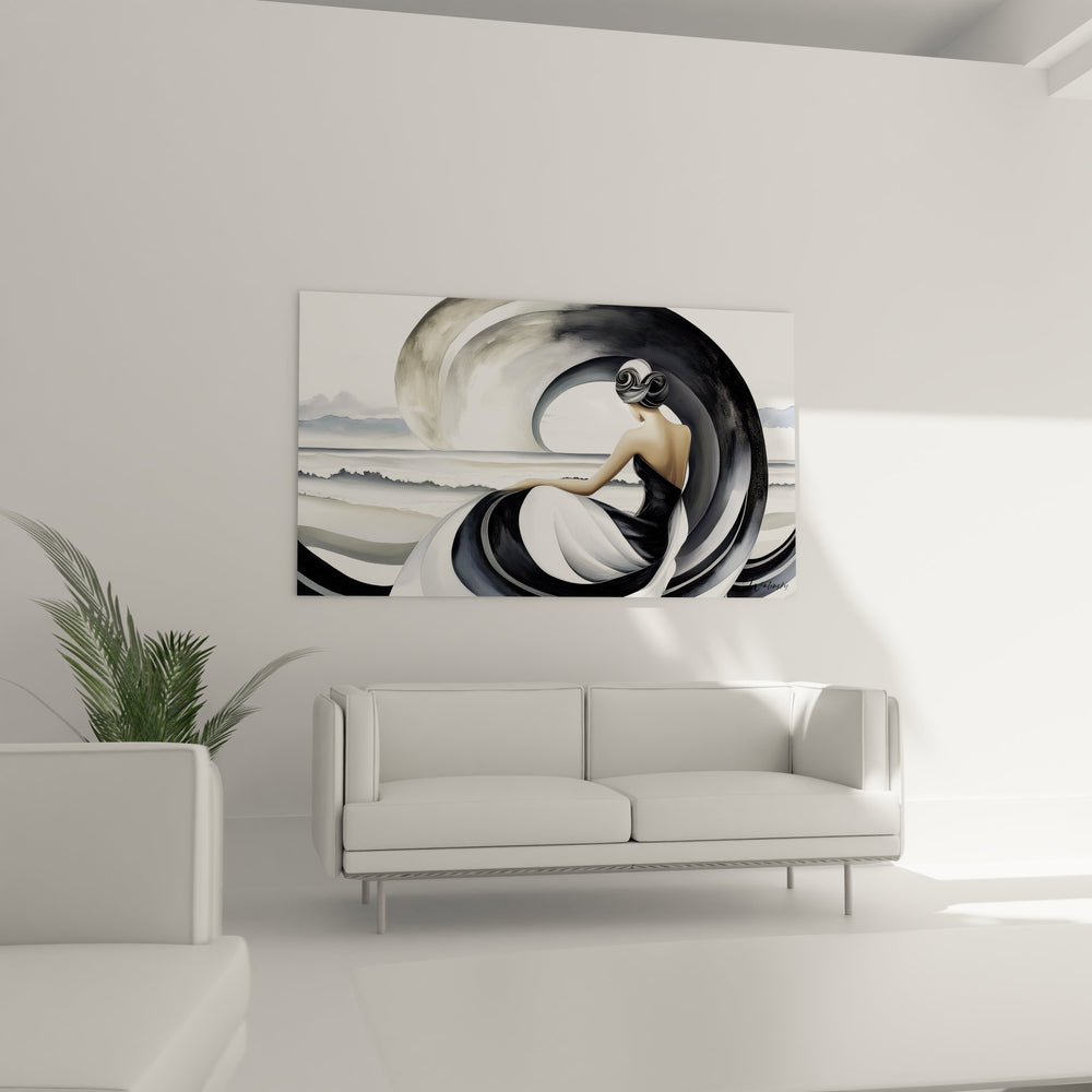 Ce tableau mural femme spirale présente une composition artistique d'une rare élégance où une silhouette féminine se fond harmonieusement dans un mouvement de spirales abstraites évoquant les vagues océaniques. La figure centrale, représentée de profil avec une coiffure sophistiquée, émerge gracieusement d'un tourbillon de formes courbes qui rappellent les rouleaux marins. L'artiste a magistralement orchestré cette décoration murale spirale en utilisant une palette monochrome raffinée, où les nuances de gris, noir et blanc créent une profondeur saisissante. Les vagues stylisées s'entrelacent autour de la figure féminine, créant un effet de mouvement perpétuel qui captive le regard. L'arrière-plan marin, aux tons poudrés et brumeux, évoque l'horizon océanique et renforce l'atmosphère contemplative de l'œuvre. Cette art mural abstrait transforme l'espace en invitant à la méditation et à l'évasion. Les courbes fluides et organiques de cette peinture moderne spirale créent un dialogue visuel entre la forme humaine et les éléments naturels, symbolisant l'harmonie entre l'être et l'univers marin qui l'entoure.