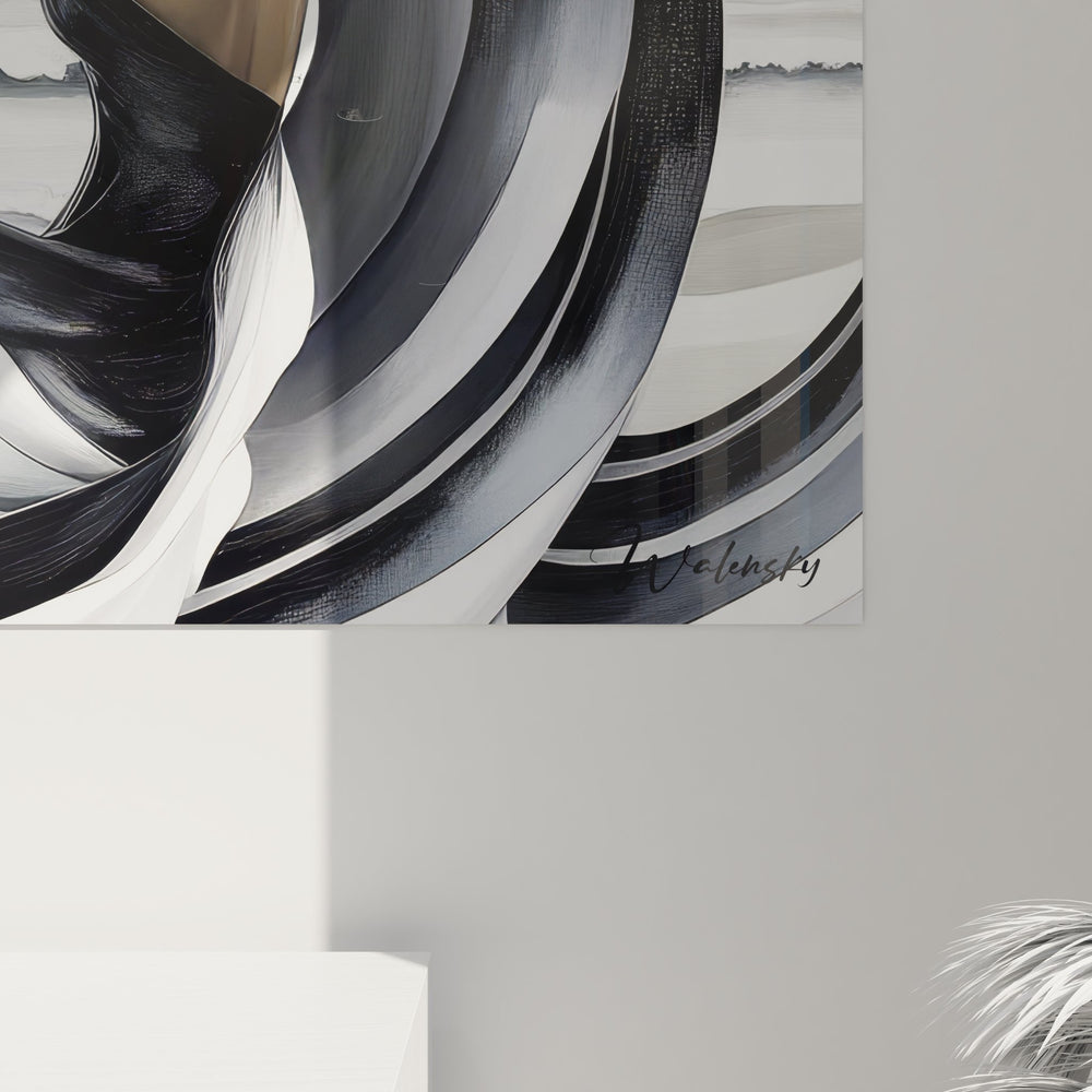 La symbolique de ce tableau design spirale puise dans l'univers marin pour exprimer la fluidité et la transformation. Les tons de gris argenté et les blancs nacrés évoquent l'écume marine, tandis que les noirs profonds rappellent les abysses océaniques. Cette œuvre d'art spirale moderne symbolise le cycle éternel de la vie et la connexion profonde entre l'humanité et les forces naturelles.