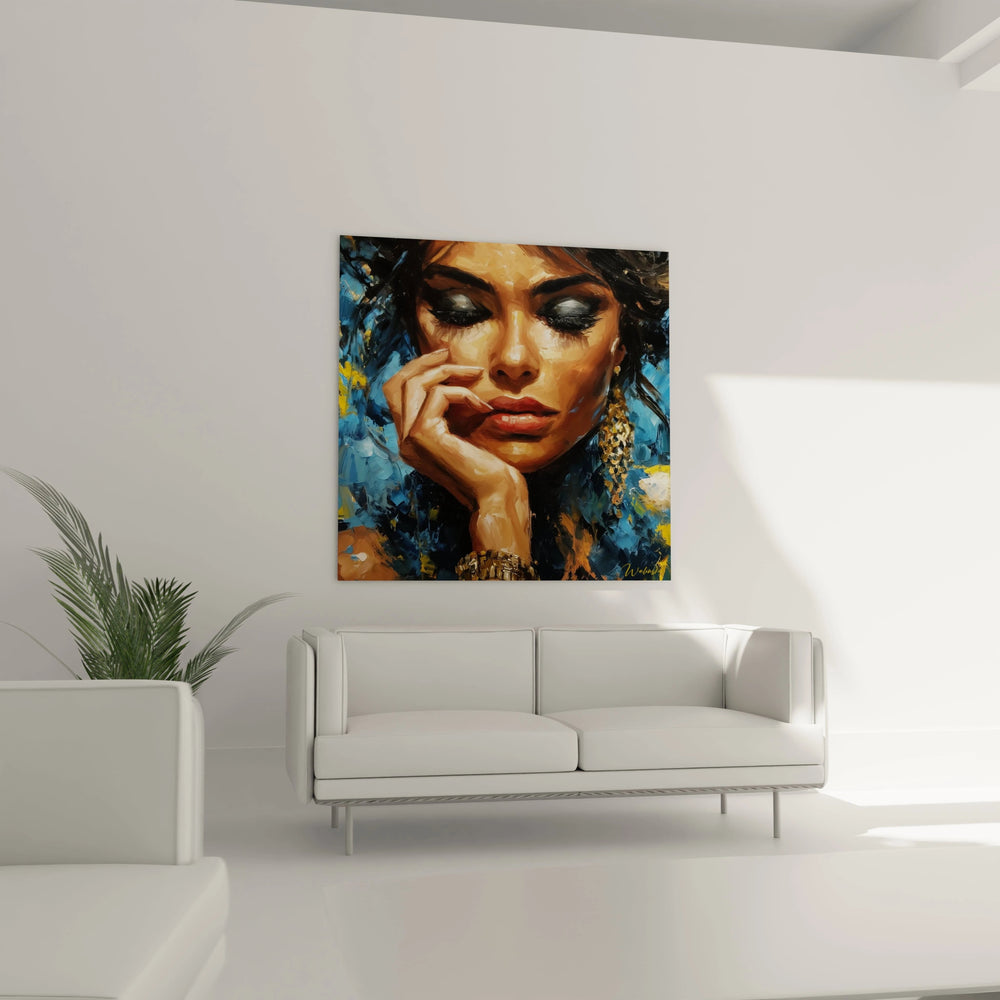 L'arrière-plan se compose d'un mélange harmonieux de bleus profonds et de touches dorées qui créent une atmosphère luxueuse et contemporaine. Les accessoires de mode, notamment les bijoux dorés visibles dans l'œuvre, ajoutent une dimension précieuse et élégante à l'ensemble. Cette représentation moderne de la beauté féminine s'inscrit parfaitement dans les codes esthétiques contemporains tout en conservant une intemporalité certaine. Ce tableau mural portrait femme élégante transforme instantanément l'atmosphère de votre intérieur.