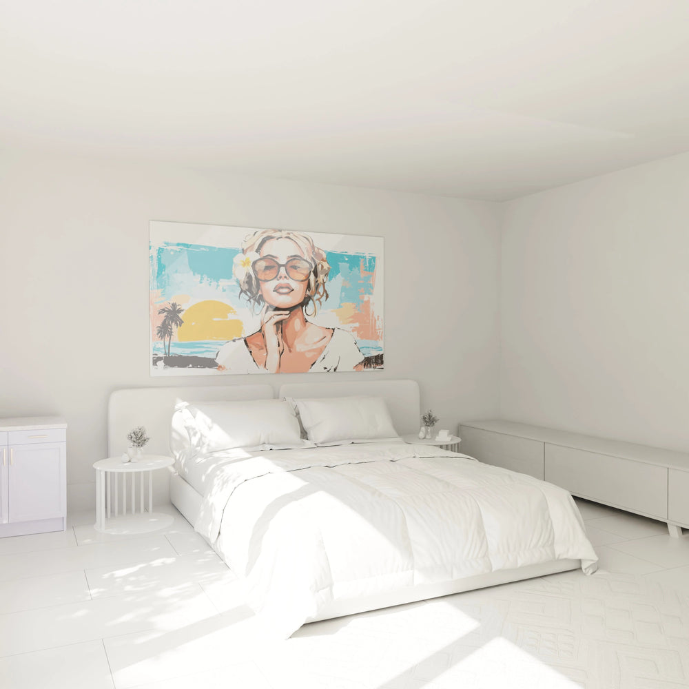 Ce tableau femme lunettes de soleil captive immédiatement par son style pop art contemporain et ses couleurs vibrantes. L'œuvre présente une femme blonde aux traits délicatement stylisés, portant des lunettes de soleil oversize aux verres orangés qui dominent la composition. Une fleur tropicale blanche et jaune orne gracieusement ses cheveux ondulés, ajoutant une touche exotique à l'ensemble. Le tableau femme été tropical dégage une atmosphère de vacances et de liberté, renforcée par l'arrière-plan évoquant un paysage côtier avec palmiers et coucher de soleil. La technique artistique mélange habilement les aplats de couleur et les détails fins, créant un équilibre parfait entre modernité et sensualité estivale.