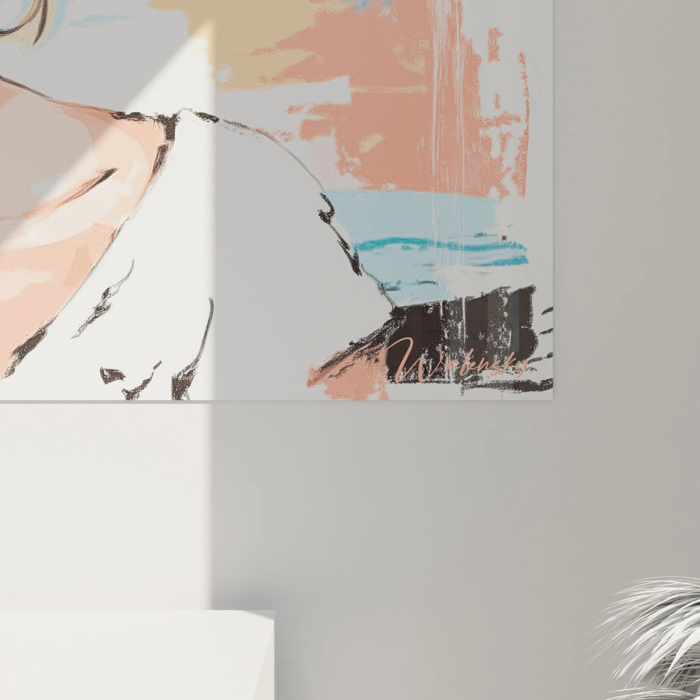 L'examen rapproché de ce tableau femme technique mixte révèle une maîtrise remarquable des effets de matière. Les cheveux présentent des variations subtiles de brillance et d'ombre, créées par des glacis délicats qui donnent volume et mouvement. La peau arbore une texture lisse et satinée, obtenue par des fondus progressifs entre les tons chair et les ombres colorées. Les lunettes de soleil bénéficient d'un traitement particulièrement soigné avec des reflets réalistes et des transparences orangées sophistiquées. Cette art mural femme contemporain combine habilement les techniques traditionnelles de modelé et les effets graphiques modernes. Les contours nets côtoient les estompages subtils, créant une dynamique visuelle captivante qui évoque à la fois la précision du dessin publicitaire et la sensibilité picturale.