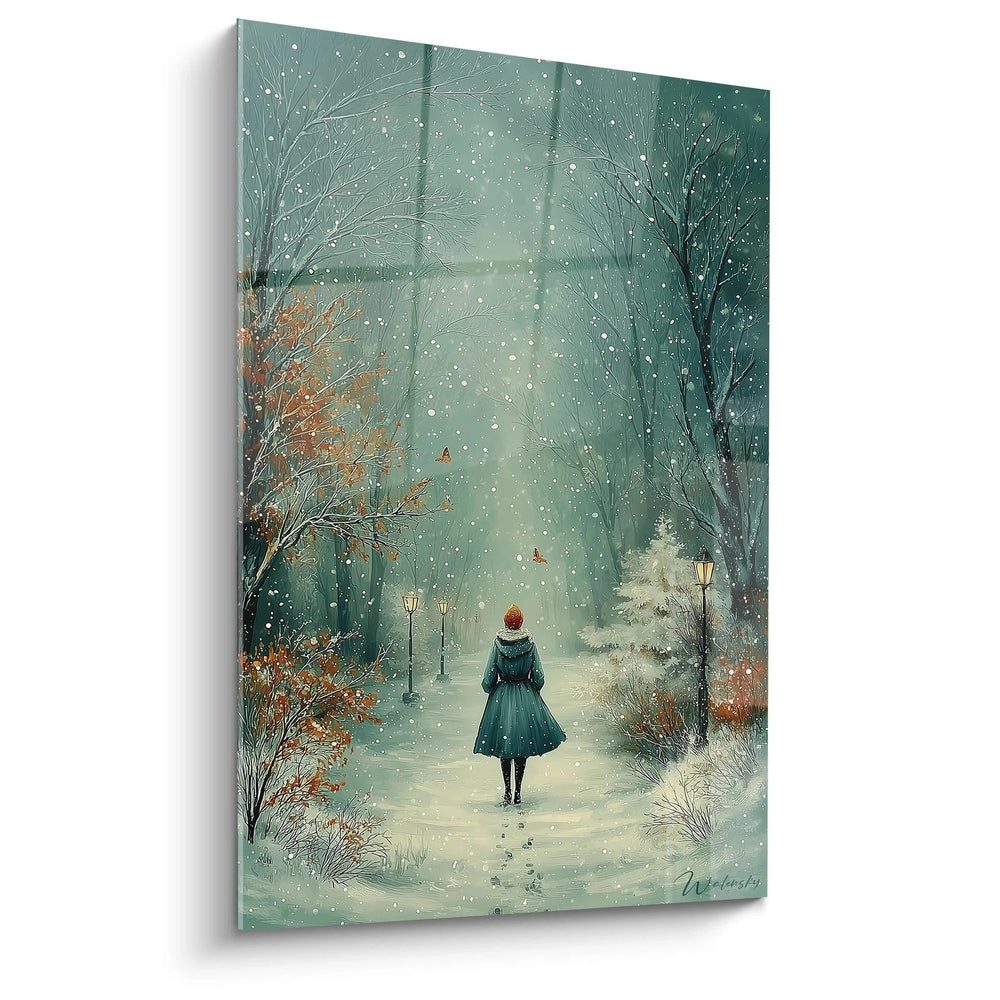 Ce tableau femme hiver révèle une composition extraordinaire où une silhouette féminine évolue dans un paysage enneigé d'une beauté saisissante. L'œuvre capture l'essence même de la saison froide à travers cette décoration murale femme neige qui dégage une atmosphère contemplative unique. La figure centrale, vêtue d'un manteau teal, se détache parfaitement contre le décor hivernal, créant un point focal naturel qui guide immédiatement le regard. Les flocons de neige qui tombent abondamment ajoutent une dimension dynamique à cette scène statique, transformant ce tableau femme hiver flocons en une véritable invitation à la rêverie. L'ensemble compose une harmonie visuelle où chaque élément contribue à créer une ambiance feutrée et poétique.