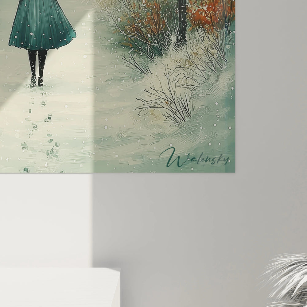 La palette chromatique de cette œuvre s'articule autour d'une harmonie de tons froids dominée par les nuances de vert-de-gris et de blanc nacré. Le manteau teal de la protagoniste constitue la couleur la plus saturée, créant un contraste saisissant avec l'environnement monochrome. Les teintes cuivrées des feuillages automnaux persistent sur certains arbres, apportant des touches de chaleur qui réchauffent subtilement l'ensemble glacé. Cette décoration murale femme hiver couleurs révèle une subtile gradation de valeurs qui va du blanc pur de la neige aux gris profonds des troncs d'arbres.