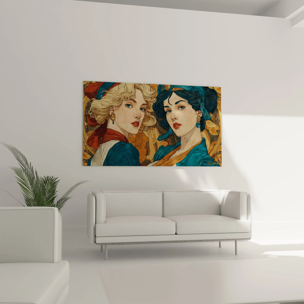 Ce tableau femmes révèle immédiatement sa singularité par la représentation de deux visages féminins aux caractéristiques opposées mais harmonieuses. L'œuvre présente une blonde aux boucles dorées et une brune aux cheveux sombres, créant un contraste saisissant qui attire instantanément le regard. Ces tableau femmes art nouveau s'inscrit dans une esthétique raffinée où chaque détail contribue à l'équilibre général. Les deux personnages arborent des boucles d'oreilles distinctives - des perles bleues qui unifient visuellement leur différence chromatique. Cette décoration murale femmes se distingue par son approche duelle de la féminité, offrant une vision artistique qui célèbre la diversité tout en maintenant une cohésion visuelle remarquable.