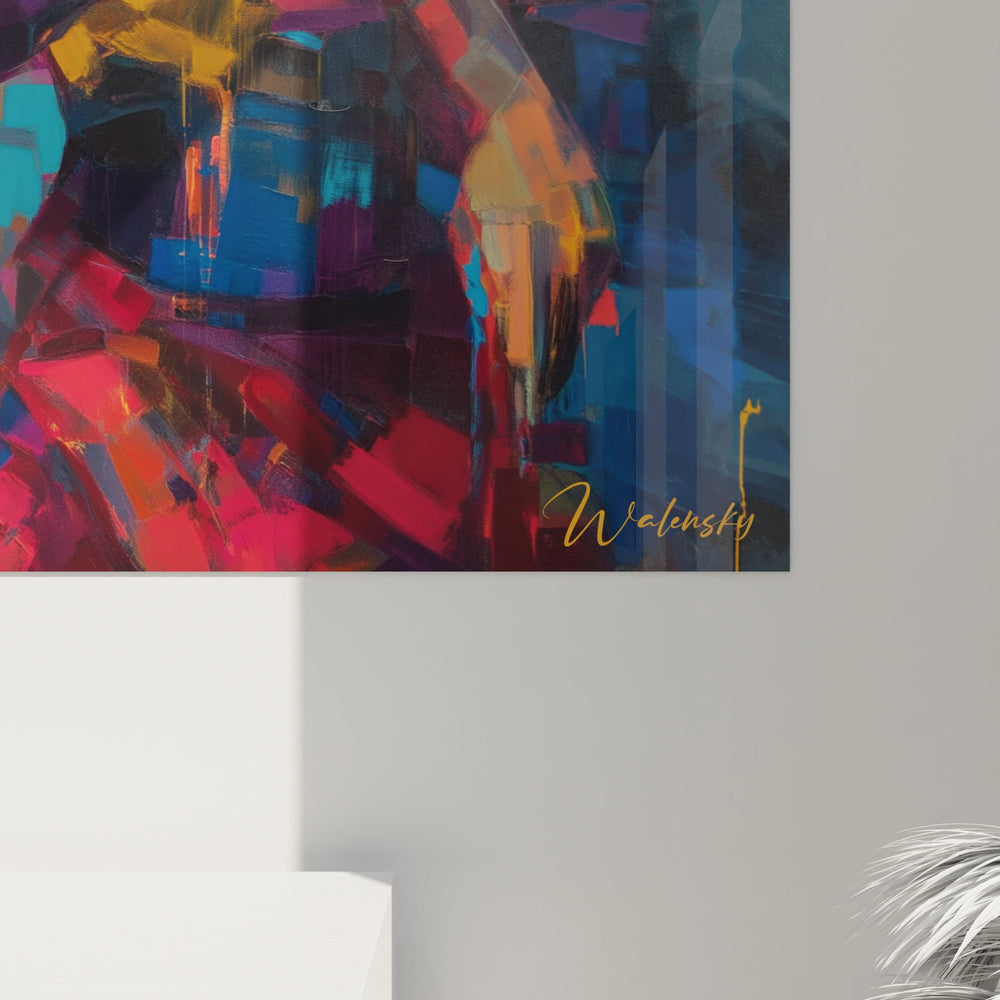 Cette œuvre dynamique s'épanouit dans des environnements contemporains aux murs neutres qui permettent à ses couleurs vives de rayonner pleinement. Un éclairage LED blanc froid révèle optimalement la richesse chromatique sans altérer les contrastes. L'association avec des éléments décoratifs aux tons blancs, gris ou noirs permet de créer un équilibre visuel sans concurrence colorée. Les espaces de vie modernes, les bureaux créatifs ou les halls d'accueil constituent des environnements idéaux pour cette art mural contemporain féminin. La présence de matériaux naturels comme le bois clair ou la pierre peut créer un contrepoint intéressant avec l'exubérance colorée de l'œuvre.