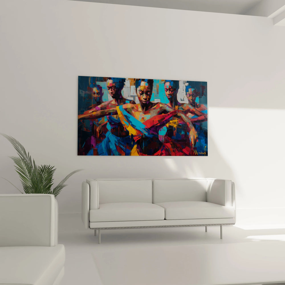 Chaque détail de ce tableau est soigneusement conçu pour célébrer la grâce et la force des femmes dans la danse africaine. Les couleurs vibrantes et les motifs dynamiques racontent une histoire d'harmonie, de passion et de connexion à la terre. En contemplant cette œuvre, vous vous sentez immédiatement transporté dans un monde où chaque mouvement est une célébration de la vie, vous inspirant à danser au rythme de votre propre aventure.