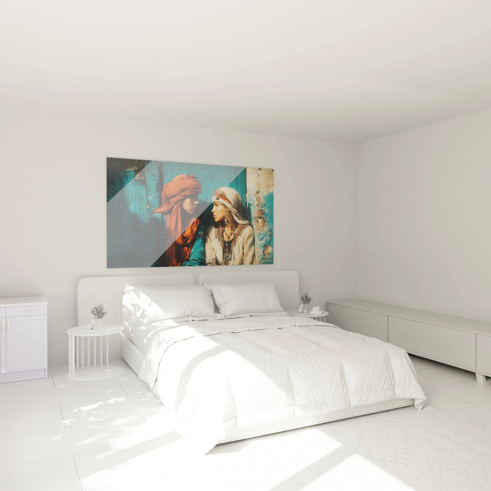 Cette art mural femmes orientales révèle une harmonie chromatique sophistiquée où les couleurs complémentaires s'équilibrent parfaitement. Le tableau femmes orientales palette méditerranéenne évoque les nuances caractéristiques des régions orientales.