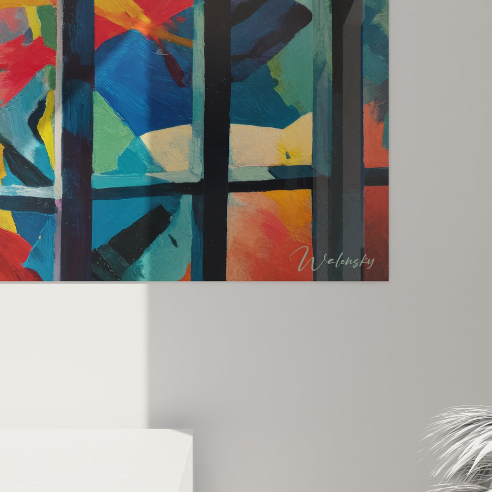 Tags : tableau fenêtre urbaine, art géométrique abstrait, décoration murale colorée, peinture moderne design, œuvre abstraite contemporaine
