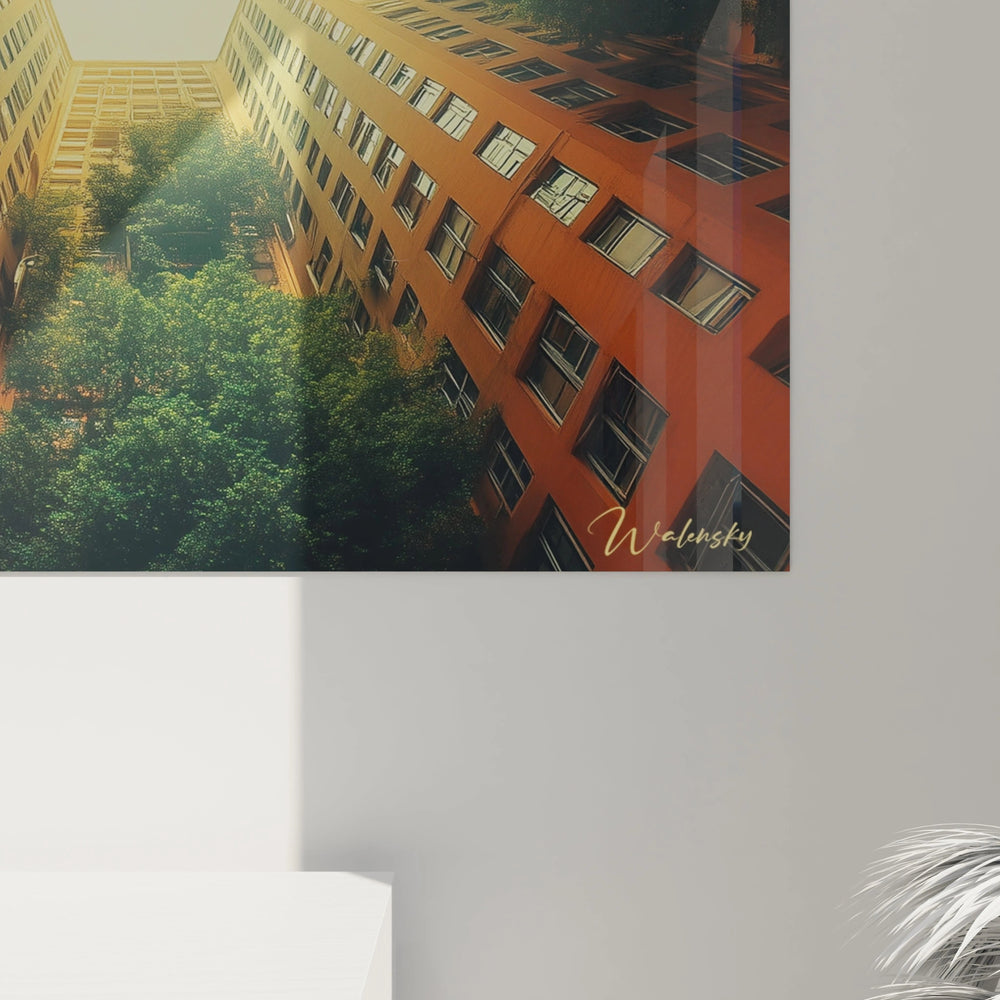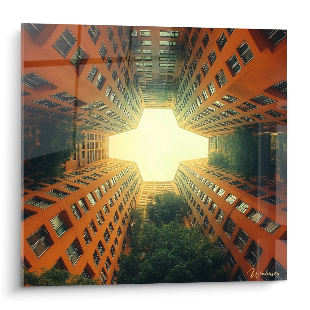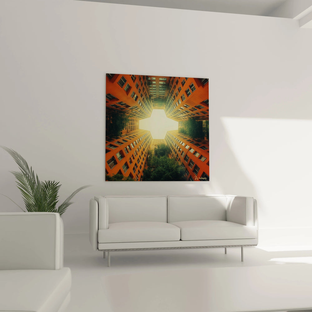 Ce tableau architecture urbaine offre une perspective unique en contre-plongée, capturant quatre façades d'immeubles orange convergeant vers une ouverture lumineuse centrale. La composition crée un effet kaléidoscopique saisissant, où l'architecture verticale encadre parfaitement le ciel. Des touches de verdure urbaine s'intercalent entre les structures, apportant un contraste naturel aux lignes géométriques des bâtiments. L'œuvre révèle une vision artistique de l'environnement urbain contemporain à travers une perspective transformative.