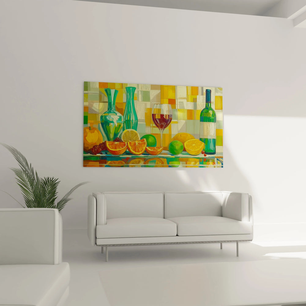 Laissez-vous emporter par la composition dynamique où chaque élément, du croquant des agrumes à la clarté du verre, évoque des sensations tactiles et des souvenirs chaleureux. Ce tableau ne se contente pas d’habiller vos murs, il installe une ambiance unique qui invite à la détente et à la joie partagée, idéale pour sublimer votre salle à manger, votre cuisine ou même votre salon. C’est une célébration de la lumière, des textures et des instants précieux autour d’une table.
