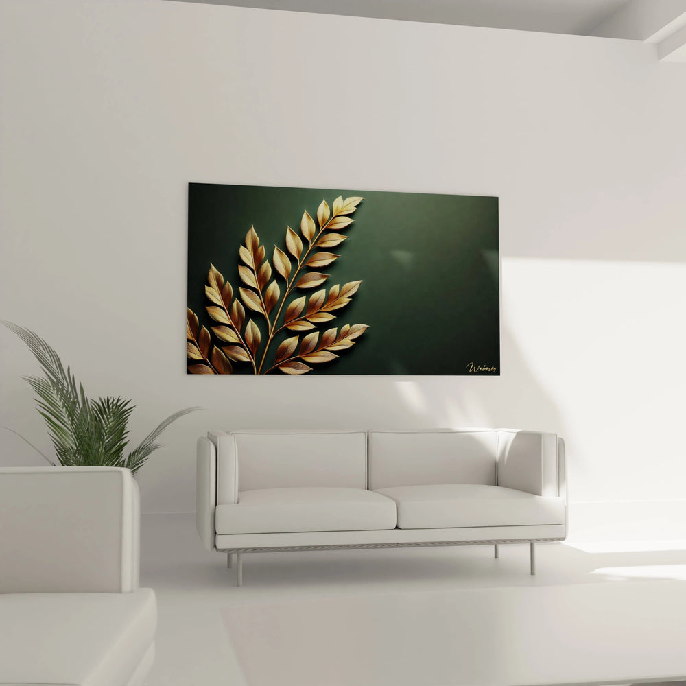 Ce tableau capture la beauté fragile et précieuse de la nature à travers des détails d’une finesse remarquable, où chaque feuille semble vibrer d’une lumière dorée. Le fond vert profond agit comme un écrin apaisant, mettant en valeur la brillance délicate de l’or et équilibrant parfaitement puissance et douceur. En le regardant, vous expérimentez une sensation de calme enveloppante, comme si vous étiez plongé dans une forêt où l’or éclaire silencieusement chaque feuille.