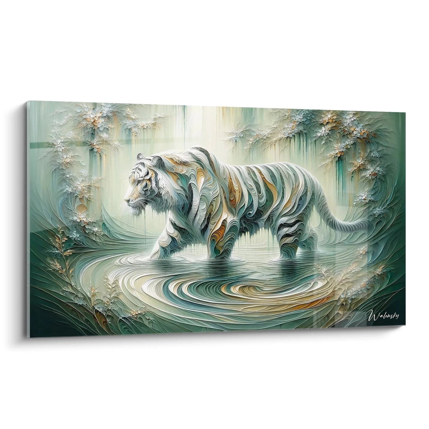 Laissez-vous transporter par la fluidité des formes et la sensation presque liquide ce tableau évoque, comme si la nature elle-même avait sculpté ce tigre dans une danse silencieuse entre ombre et lumière. Ce spectacle visuel apaise, fascine, et dégage une mystérieuse force tranquille, parfaite pour instaurer une ambiance à la fois luxueuse et intimiste chez vous.
