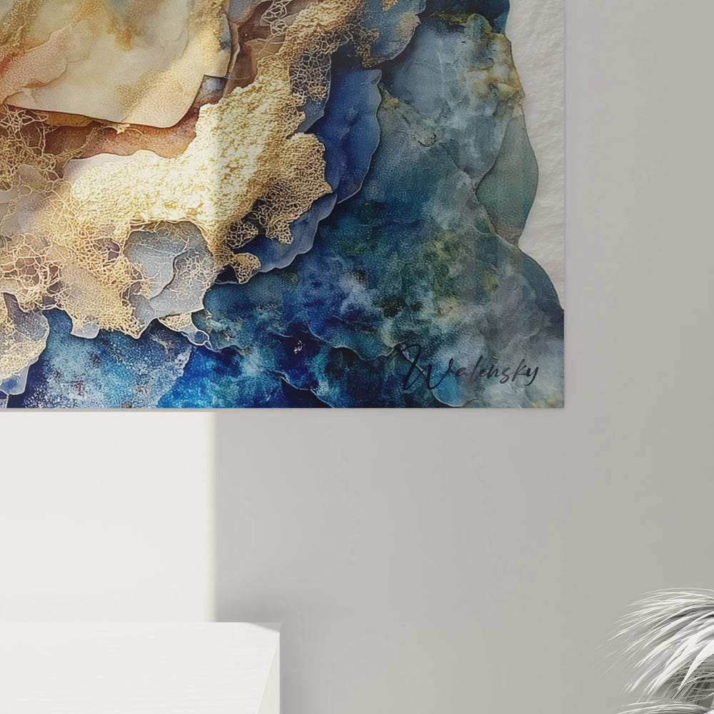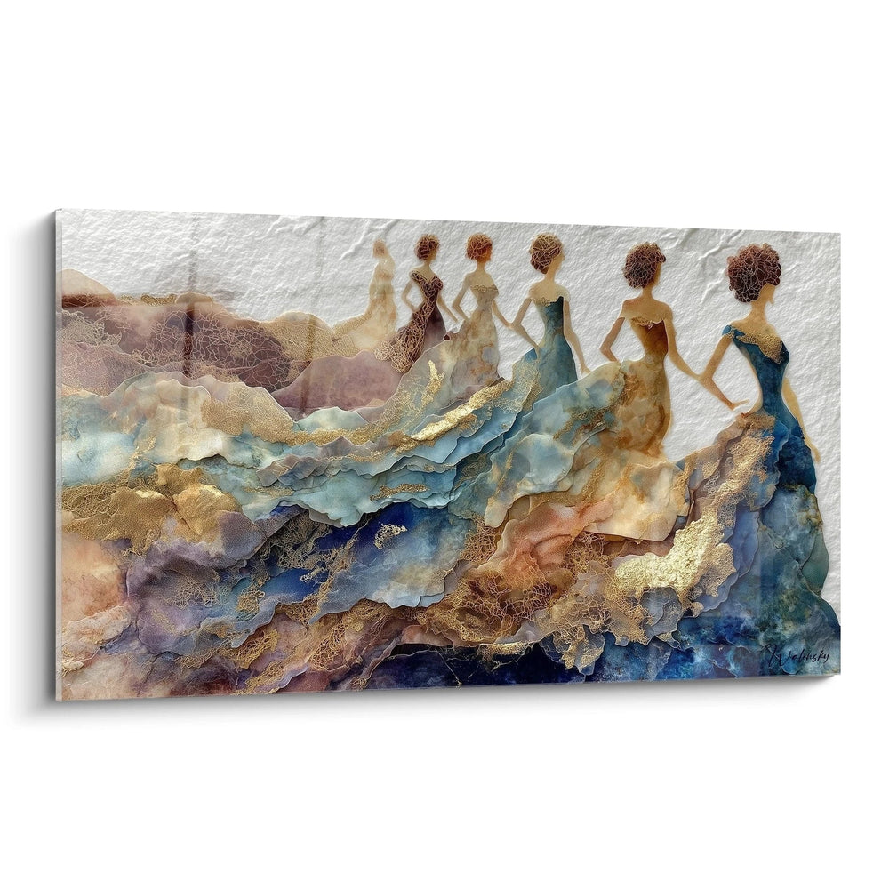 La partie inférieure du tableau mural révèle un paysage abstrait aux multiples strates colorées, créant un contraste saisissant avec les figures élégantes. Les teintes se déclinent en camaïeux subtils de bleus profonds, d'ocres chaleureux, de violets délicats et de dorés chatoyants. Ces couleurs fluides semblent s'écouler naturellement, évoquant des formations géologiques ou des paysages marins contemporains. L'ensemble crée une atmosphère luxueuse et raffinée, parfaitement adaptée aux intérieurs contemporains exigeants.