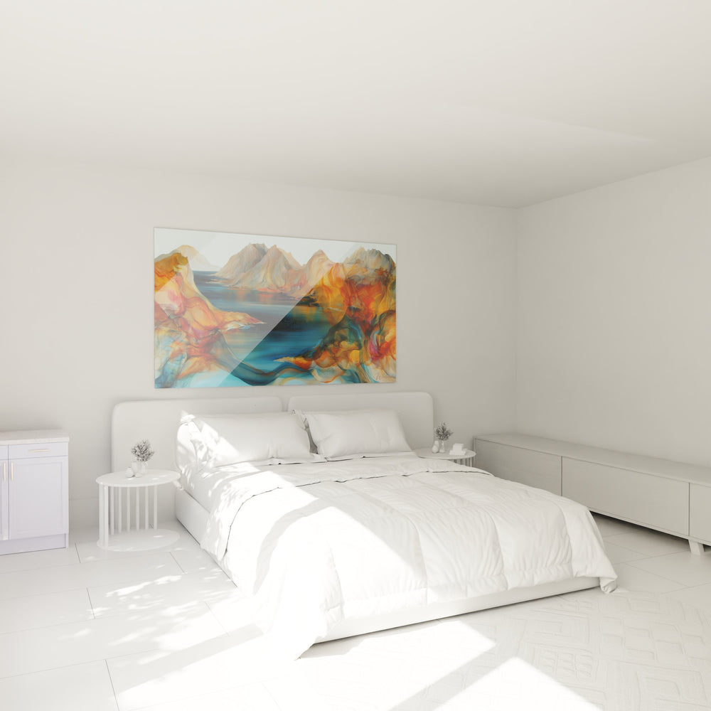 Cette œuvre d'art contemporaine présente un tableau mural paysage insulaire d'une beauté saisissante, mêlant la grandeur des fjords nordiques à l'intimité des archipels colorés. L'artiste a créé une vision onirique où les montagnes flamboyantes se dressent majestueusement autour d'un lac bleu profond, créant un contraste spectaculaire entre les tons chauds et froids. Les formations rocheuses, rendues dans des teintes orangées, rouges et dorées, évoquent les paysages volcaniques des îles lointaines, tandis que les eaux tranquilles reflètent cette symphonie de couleurs avec une sérénité parfaite. Cette décoration murale fjord capture l'essence même des paysages nordiques stylisés, où chaque élément semble danser dans une harmonie fluide. Les techniques de superposition et de transparence utilisées donnent une impression de mouvement perpétuel, comme si la nature elle-même était en constante transformation. Ce tableau moderne archipel transforme instantanément l'atmosphère d'un espace, apportant une dimension poétique et contemplative qui invite au voyage intérieur.