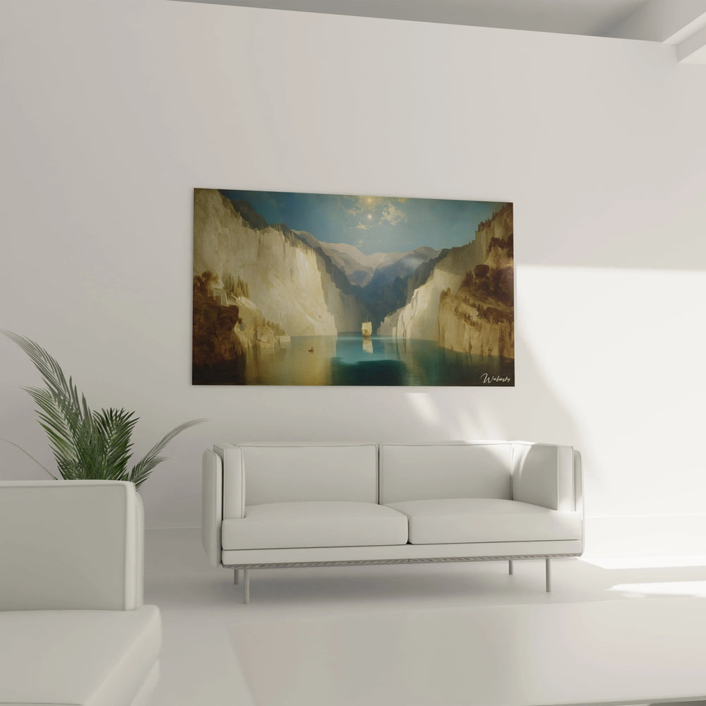 Ce tableau fjord révèle un paysage nordique d'une beauté saisissante, dominé par d'imposantes falaises calcaires qui s'élèvent majestueusement des eaux turquoise. L'œuvre capture un moment de navigation paisible où un navire aux voiles dorées glisse silencieusement entre les parois rocheuses. La lumière céleste filtrée par les nuages crée une atmosphère mystique et sublime. Ce tableau fjord navigateur solitaire exprime parfaitement la grandeur de la nature nordique avec ses formations géologiques spectaculaires. Les reflets aquatiques amplifient la sensation d'immensité et de tranquillité. Chaque élément contribue à créer une composition d'une harmonie parfaite entre l'eau, la roche et le ciel.