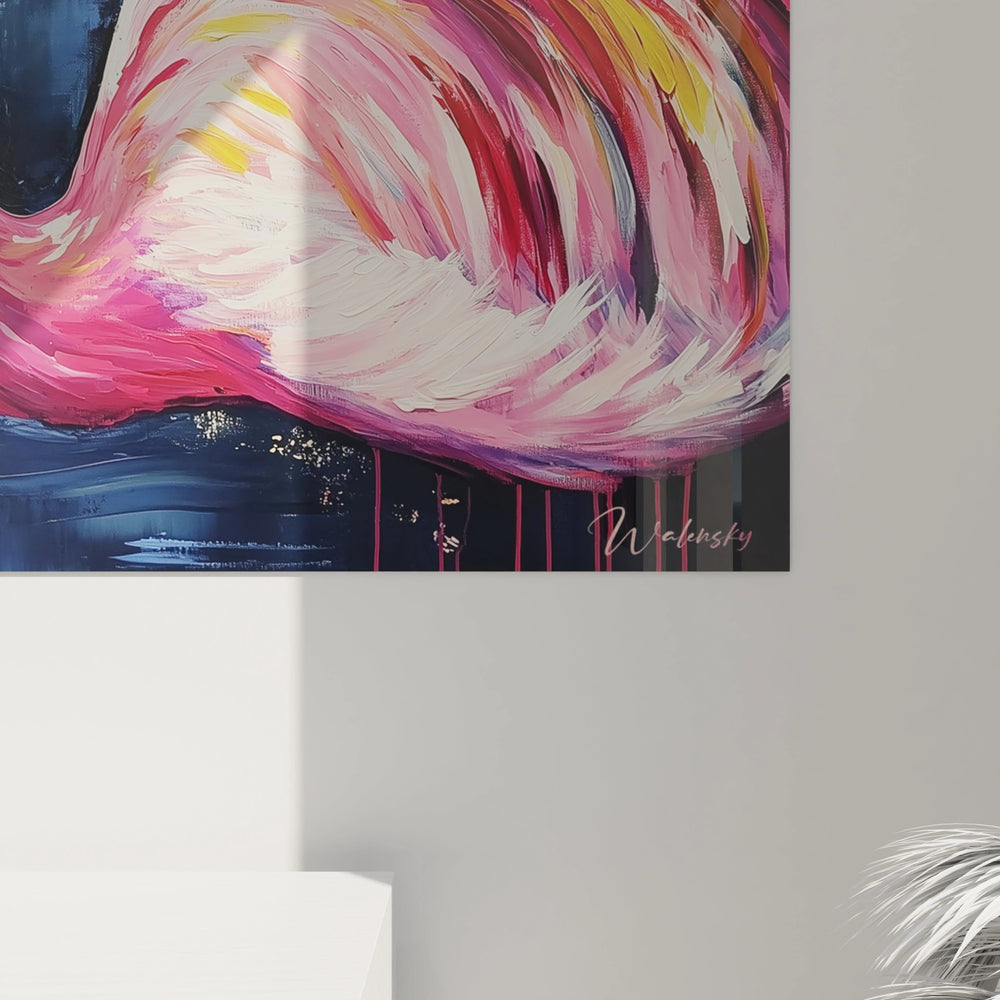 Ce tableau flamant rose révèle immédiatement sa magnificence par la posture gracieuse de l'oiseau tropical qui domine la composition. L'œuvre capture un flamant rose dans une position caractéristique, son cou élégamment courbé créant une ligne serpentine naturelle. Le tableau flamant rose contemporain se distingue par son traitement artistique moderne où les couleurs vives contrastent avec un arrière-plan sombre et texturé. L'oiseau occupe une position centrale légèrement décentrée, permettant au regard de suivre naturellement la courbe de son long cou. Cette décoration murale flamant rose présente une approche stylistique qui mélange réalisme et expressionnisme, donnant vie à ce symbole de grâce tropicale.