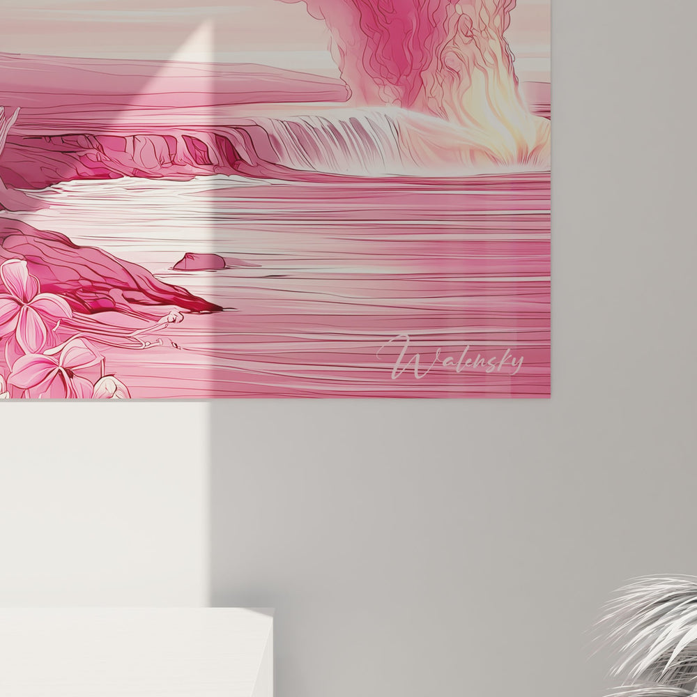La palette rose monochrome de cette œuvre évoque la féminité, la douceur et l'élégance naturelle. Le flamant rose, symbole d'équilibre et de grâce, représente la beauté pure et l'harmonie spirituelle. Les nuances variant du rose poudré au fuchsia intense créent une profondeur visuelle captivante, tandis que les tons tropicaux chaleureux apportent une sensation de bien-être et d'évasion vers des contrées lointaines.