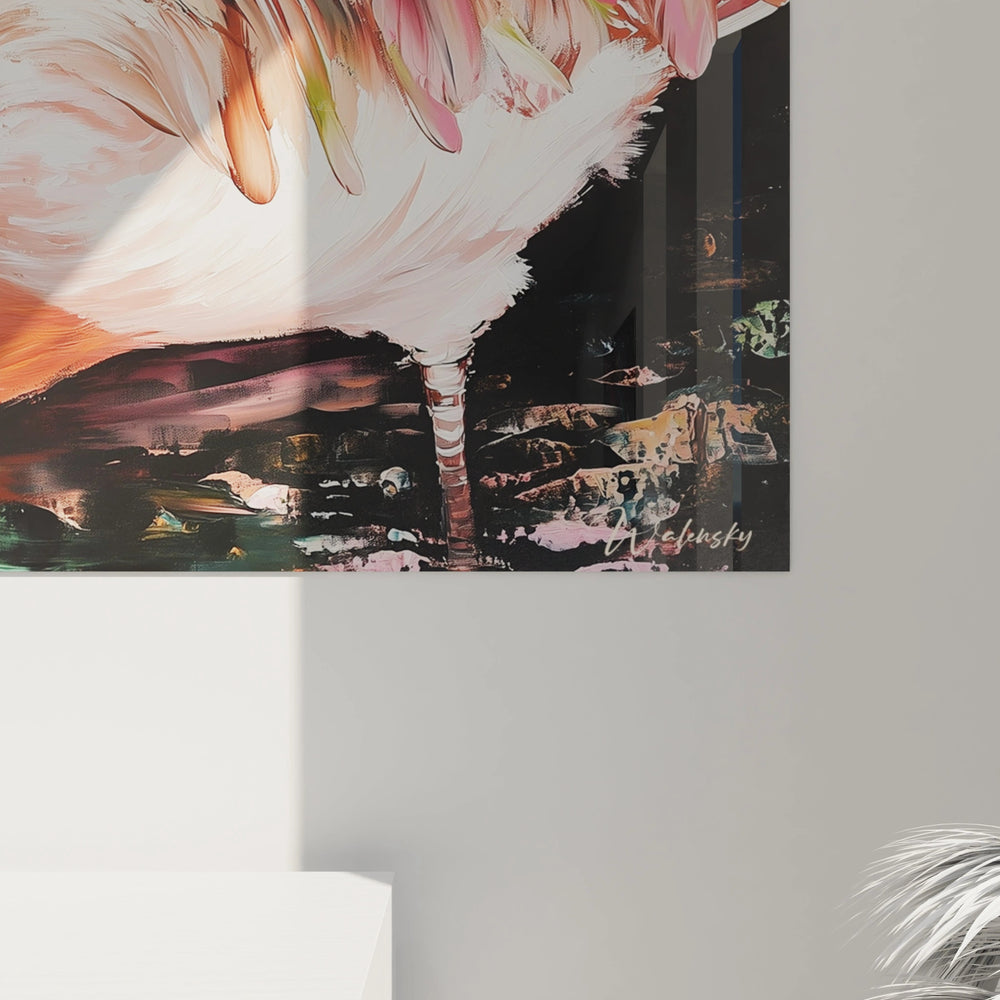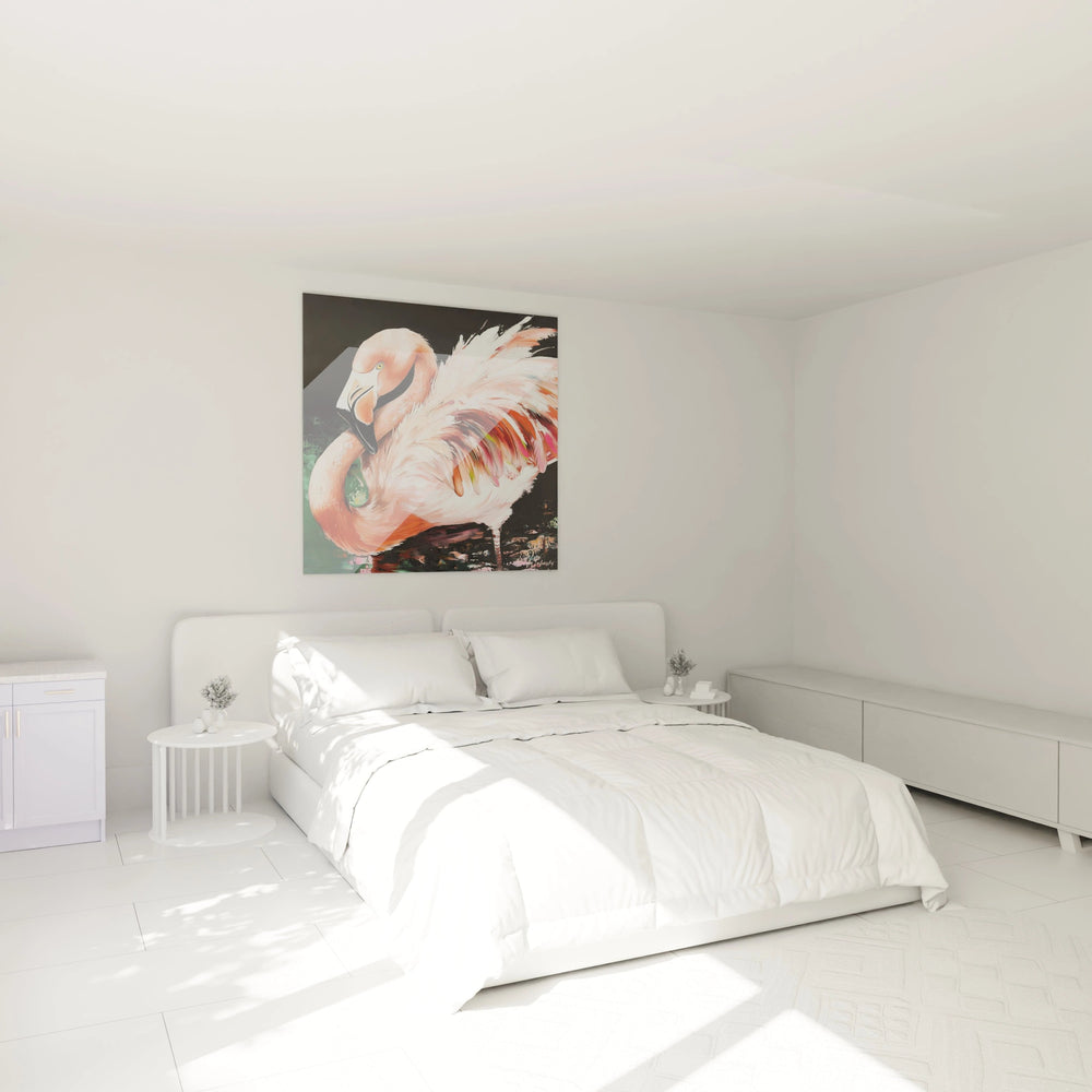 L'expérience visuelle de ce tableau flamant rose grand format évolue remarquablement selon la distance d'observation. À distance, l'œuvre impressionne par sa cohérence d'ensemble et la force de sa composition générale. En s'approchant, une multitude de détails se révèlent progressivement : les nuances subtiles dans l'œil de l'oiseau, les variations de texture entre les différentes zones du plumage, et les jeux de lumière qui sculptent chaque forme. Cette richesse de détails fait de cette décoration murale flamant rose premium une œuvre qui ne se lasse jamais de contempler. L'effet de profondeur créé par les contrastes chromatiques donne l'impression que l'oiseau pourrait s'animer à tout moment.