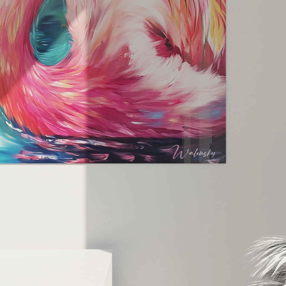 Cette œuvre présente un flamant rose magnifiquement stylisé dans une pose gracieuse, le cou élégamment courbé selon la posture naturelle de l'espèce. Le tableau flamant rose artistique se distingue par son traitement pictural sophistiqué où chaque plume semble danser dans la lumière. L'oiseau occupe une position centrale dominante, créant un point focal puissant qui attire immédiatement le regard. L'œil doré du flamant apporte une touche de vie intense, contrastant harmonieusement avec les tons rosés du plumage. Cette art mural flamant rose révèle une maîtrise technique remarquable dans le rendu des textures organiques.