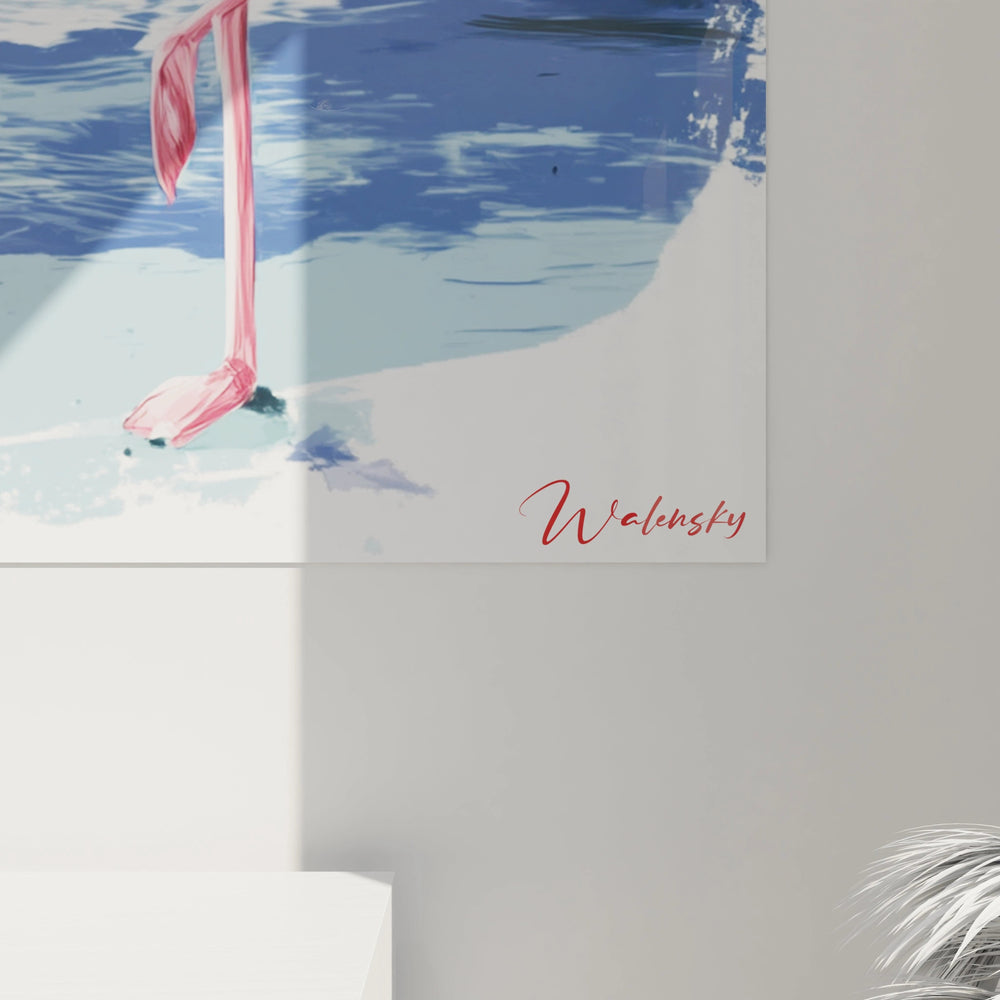 Cette œuvre se distingue par plusieurs éléments visuels exceptionnels qui la rendent immédiatement reconnaissable. La pose du flamant, équilibriste gracieux sur une seule patte, capture un moment de pure poésie naturelle. L'interaction subtile entre la lumière dorée du couchant et les reflets rosés sur l'eau crée une atmosphère magique unique. Cette art mural flamant rose tropical présente un cadrage parfait où aucun élément ne semble superflu. La signature stylisée "Wolinsky" en rouge corail s'intègre naturellement dans l'angle inférieur droit. Le traitement particulier du soleil, ni trop stylisé ni trop réaliste, apporte une dimension artistique distinctive. Cette tableau flamant rose soleil orange capture l'essence même de l'évasion tropicale avec une authenticité saisissante qui transcende la simple représentation.