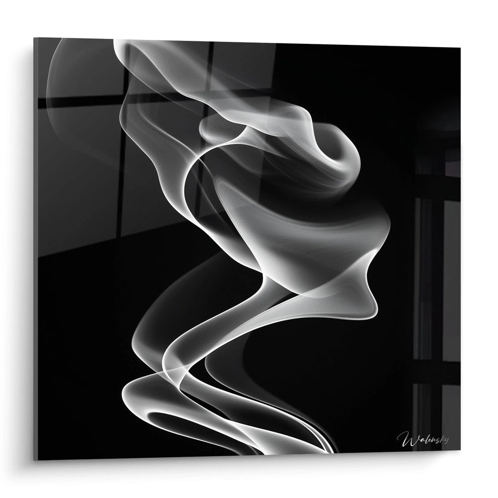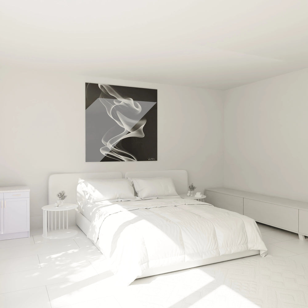 Ce tableau fumée abstraite captive immédiatement par sa composition éthérée et ses lignes fluides d'une grâce saisissante. L'œuvre se démarque par son contraste saisissant entre un fond noir profond et des formes blanches ondulantes qui semblent danser dans l'espace. La première impression est celle d'un mouvement perpétuel figé dans le temps, comme si la fumée avait été capturée dans son état le plus élégant. Les formes vaporeuses créent une chorégraphie visuelle qui attire le regard et l'invite à suivre chaque courbe sinueuse de ce tableau fumée abstraite aux lignes délicates.