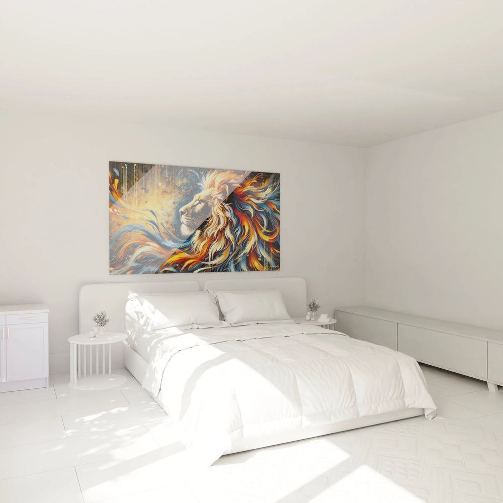 Chaque regard posé sur ce tableau révèle une double sensation fascinante. D’un côté, la crinière tourbillonnante, animée de traits évoquant le feu et le vent, donne vie à une énergie presque palpable. Les flammes jaunes et oranges semblent murmurer la chaleur du soleil africain, tandis que les touches de bleu apportent une fraîcheur apaisante. De l’autre, le visage serein du lion incarne l’autorité calme, un équilibre parfait entre une force sauvage et une sagesse profonde. Cette œuvre sublime transforme votre espace en un sanctuaire où s’exprime la grandeur de la nature.