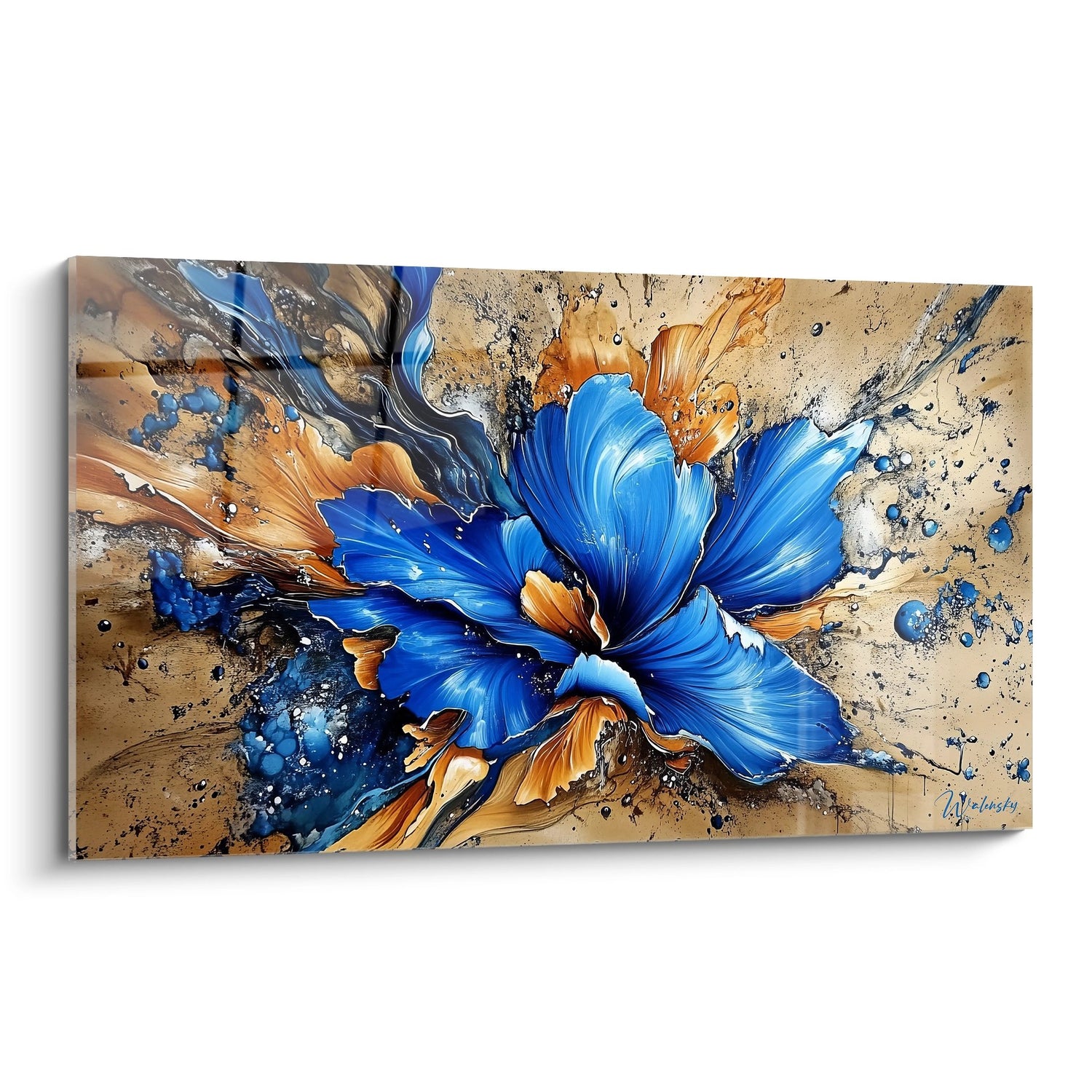 Ce tableau mural fleur abstraite présente une composition saisissante où une fleur bleue stylisée explose dans un tourbillon de couleurs vibrantes. L'œuvre capture l'essence d'une fleur contemporaine abstraite avec ses pétales bleus électriques qui se déploient avec une énergie remarquable sur un fond beige texturé. Les éclaboussures artistiques bleues et orangées créent un mouvement dynamique qui donne vie à cette peinture florale moderne. La technique mixte utilisée combine des coulures fluides et des projections contrôlées, évoquant la spontanéité de la nature tout en maintenant une structure compositionnelle maîtrisée. Ce tableau décoratif fleur design se distingue par son approche non-figurative qui transforme l'élément floral en une explosion d'émotions colorées. Les détails minutieux des pétales, rehaussés de reflets lumineux, contrastent avec la gestuelle libre des éclaboussures environnantes. Cette œuvre d'art murale florale moderne s'inscrit dans une démarche artistique contemporaine où la nature devient prétexte à une exploration picturale audacieuse et expressive.