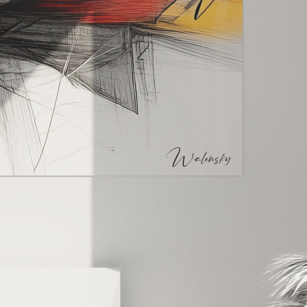 Ce tableau mural fleur abstraite présente une composition artistique saisissante où les traits dynamiques créent une explosion florale contemporaine. L'œuvre combine magistralement des lignes graphiques noires fluides avec des touches de couleur éclatantes, créant un mouvement visuel captivant. Les pétales stylisés semblent jaillir du centre de la composition dans un élan créatif, tandis que les nuances dorées et orangées apportent une chaleur lumineuse à l'ensemble. Cette création artistique murale révèle un travail méticuleux sur la gestuelle, où chaque trait de dessin contribue à l'harmonie globale. Les effets de transparence et les superpositions créent une profondeur remarquable, transformant cette décoration murale contemporaine en véritable point focal. L'artiste a su capturer l'essence même de l'éclosion florale à travers une approche résolument moderne, faisant de ce tableau dessin floral une pièce unique qui dialogue parfaitement avec les intérieurs contemporains et épurés.