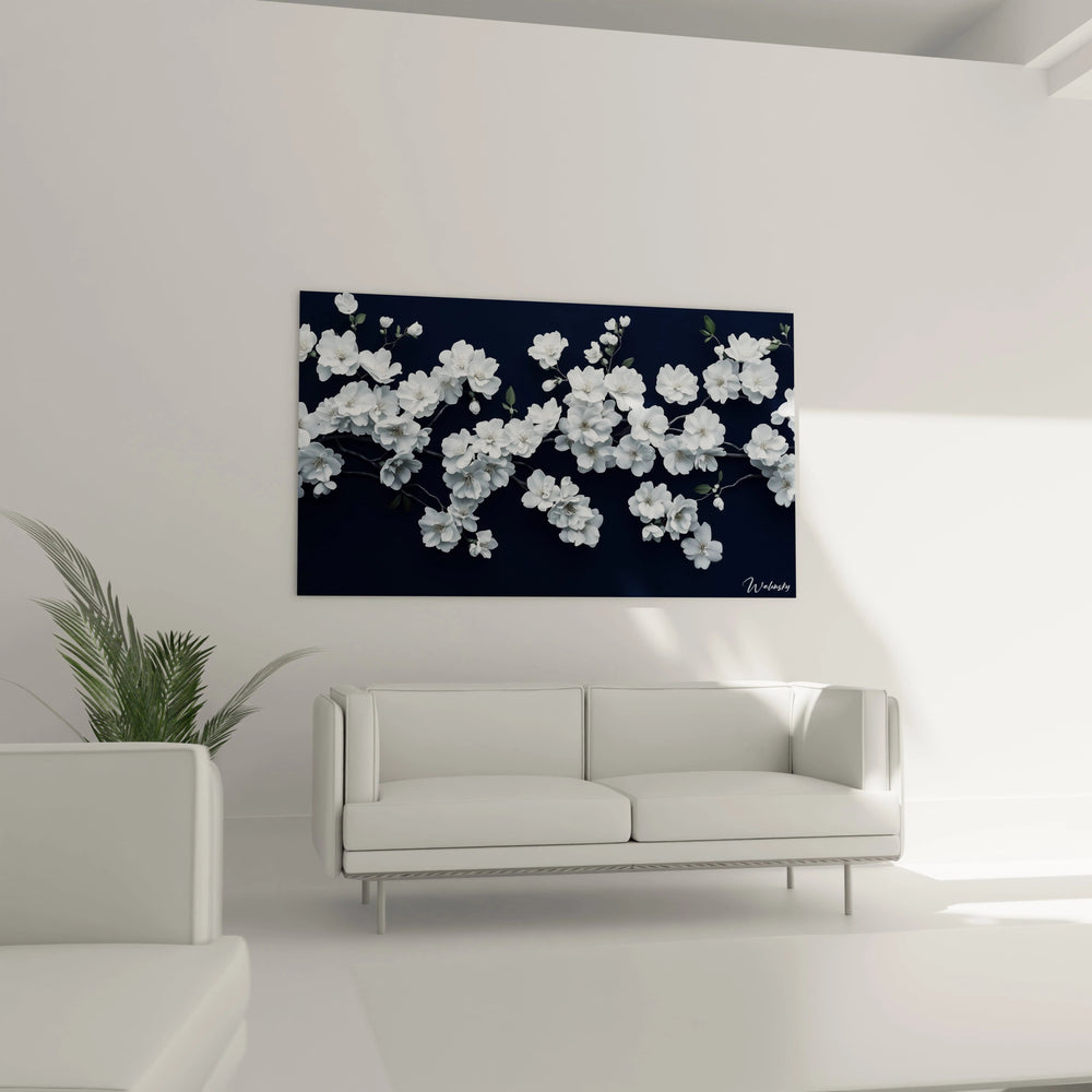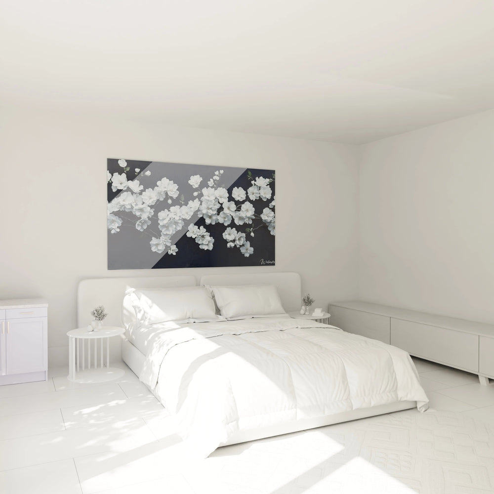 Cette Ćuvre sâinspire de la tradition japonaise du "hanami", oĂč chaque fleur de cerisier devient le symbole dâun instant fugace mais chargĂ© de sens. En contemplant ce tableau, vous ressentez une profonde tranquillitĂ©, presque un moment suspendu hors du temps, qui apaise les sens et invite Ă la mĂ©ditation. Les branches dĂ©licates, chargĂ©es de fleurs blanches Ă©clatantes, semblent prĂȘtes Ă sâanimer, promettant la renaissance et le renouveau.