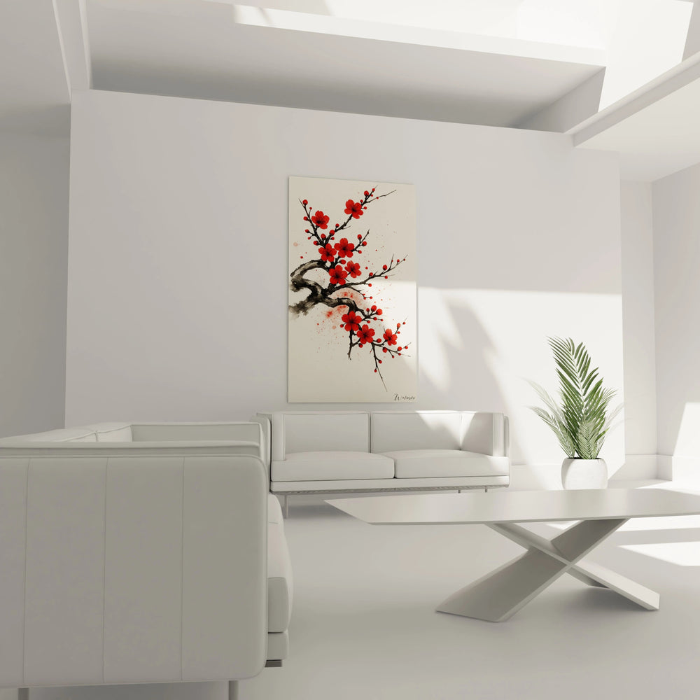 Imaginez un instant la délicatesse d’un jardin japonais au printemps, où le vent caresse doucement les pétales rouges de cerisiers en fleurs. Le Tableau Fleur de Sang -Édition Japon vous transporte dans cette atmosphère unique, où chaque coup de pinceau révèle l’harmonie subtile entre minimalisme et émotion vibrante.