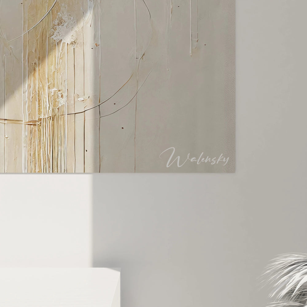 Ce tableau est né d’un désir profond de traduire la beauté fragile et majestueuse du monde végétal à travers un style abstrait et épuré. En le contemplant, vous ressentez la tension délicate entre la force et la douceur, reflet d’une nature qui renaît sans cesse avec grâce. Les nuances choisies – blanc immaculé, beige chaleureux et accents bronze délicats – évoquent la lumière douce du matin qui révèle chaque détail avec une finesse exquise.