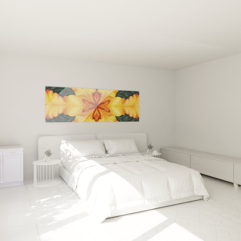 Ce tableau mural fleur fractale présente une composition hypnotique centrée sur une magnifique fleur fractale dorée aux pétales délicatement sculptés par les mathématiques. L'œuvre révèle une symétrie parfaite où chaque pétale orange et doré s'épanouit dans un ballet géométrique fascinant. Les tons oranges vibrants se déploient du centre vers l'extérieur, créant un effet de profondeur saisissant qui attire immédiatement le regard. Cette création fractale florale combine la beauté naturelle des fleurs avec la précision mathématique des fractales, offrant un art mural contemporain d'une rare élégance. Les nuances de jaune doré et d'orange cuivré s'harmonisent parfaitement avec les touches de vert émeraude qui encadrent la composition. Ce tableau décoratif moderne transforme l'espace en galerie d'art, apportant une dimension artistique sophistiquée à votre intérieur. L'art fractal floral révèle ici toute sa splendeur, mêlant organicité et géométrie dans une danse visuelle captivante.