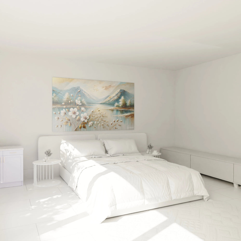 Ce tableau est bien plus qu’une simple décoration : c’est une véritable invitation à la contemplation. Les montagnes majestueuses, baignant dans une lumière dorée douce, évoquent la force tranquille de la nature sauvage, tandis que les fleurs délicates viennent apporter une tendresse pleine d’espoir et de vie. En posant les yeux sur cette œuvre, vous ressentirez le calme apaisant d’un paysage où chaque détail raconte une histoire de beauté et de sérénité.