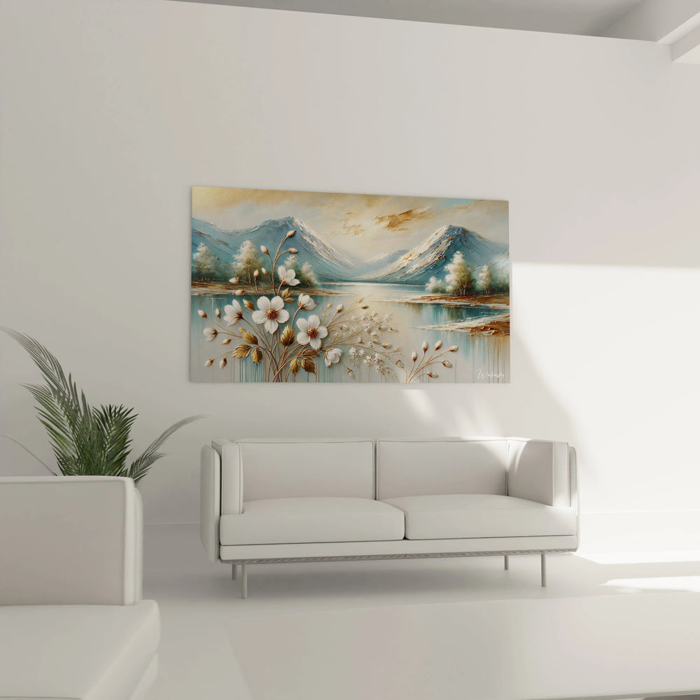 Ce tableau est une invitation à vous évader, à vous immerger dans un instant suspendu où la nature révèle toute sa puissance et sa fragilité. Il incarne la magie d’une rencontre entre deux univers – la majesté des montagnes et la délicatesse des fleurs – pour enrichir votre intérieur d’une ambiance raffinée et sereine.