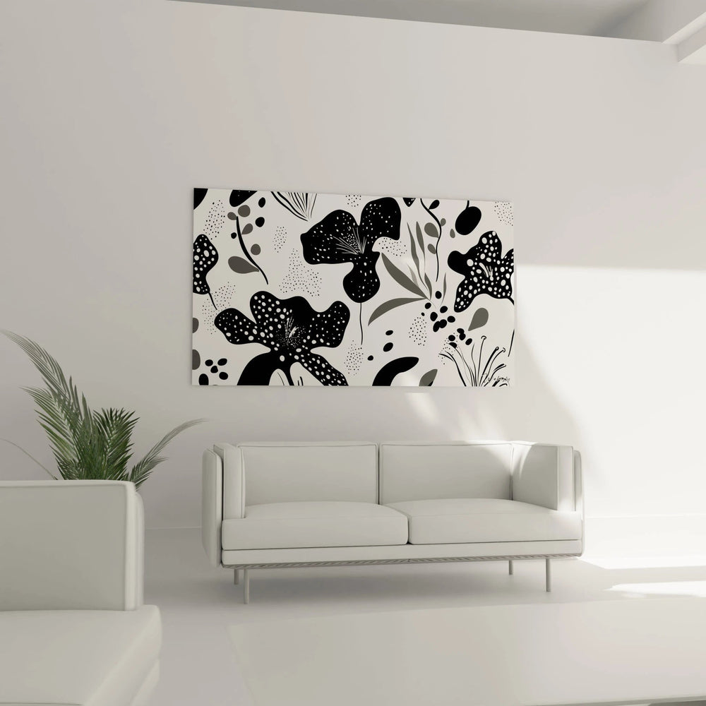 Ce tableau floral noir et blanc se distingue par son approche graphique moderne de l'art botanique contemporain. L'œuvre présente une composition florale stylisée où dominent de grandes fleurs aux pétales organiques, parsemées de motifs pointillés créant une texture visuelle captivante. Cette décoration murale florale monochrome frappe immédiatement par son contraste saisissant entre les formes pleines noires et les espaces blancs immaculés, créant un équilibre visuel parfait pour tout intérieur moderne.