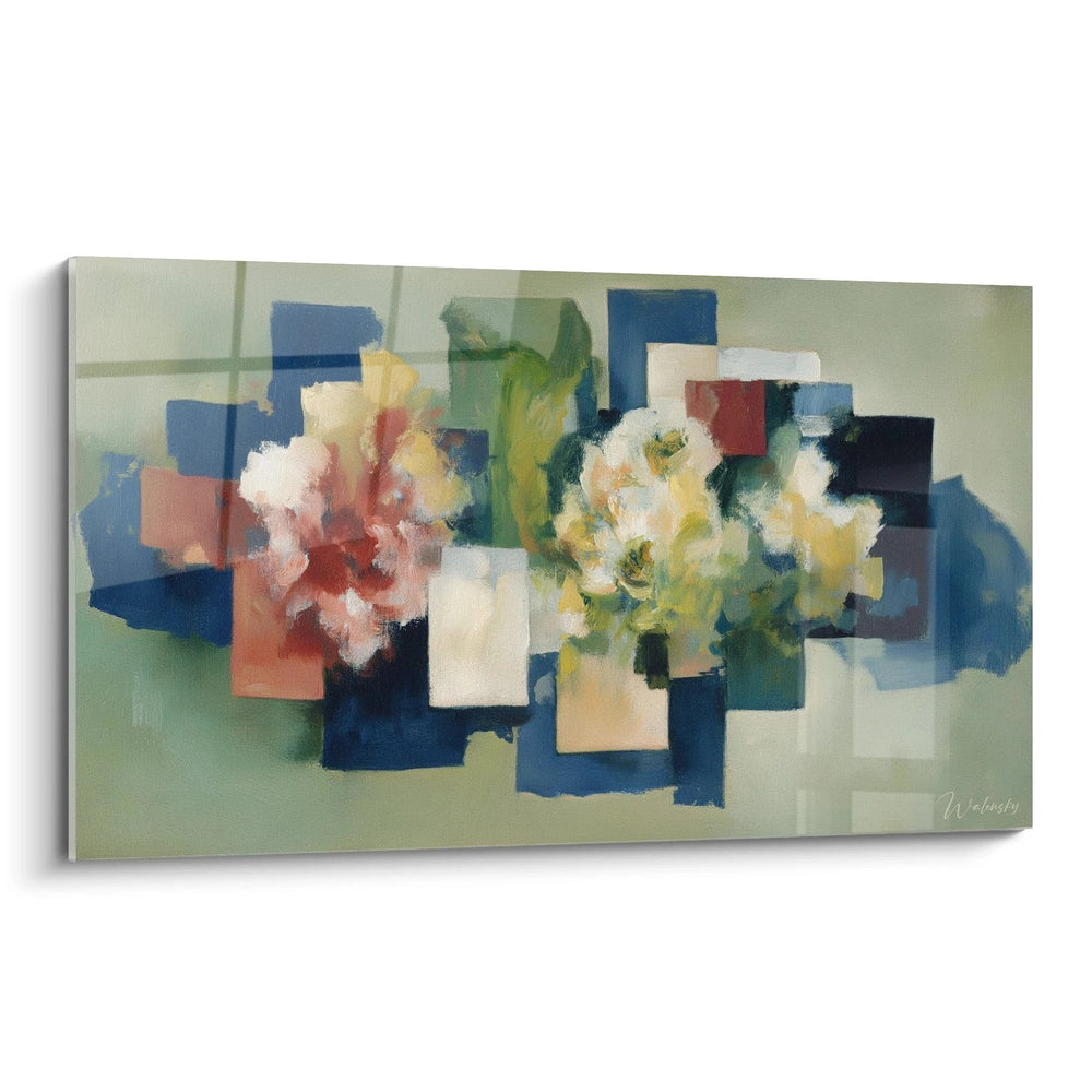Ce tableau fleurs abstraites révèle une approche contemporaine de la représentation florale, où les formes botaniques se dissolvent dans une composition géométrique audacieuse. L'œuvre présente deux bouquets floraux stylisés, l'un aux tonalités roses et corail à gauche, l'autre aux nuances vertes et jaunes à droite. Ces tableau fleurs géométriques s'épanouissent sur un fond composé de rectangles et carrés aux teintes bleues variées, créant un contraste saisissant. La signature discrète dans le coin inférieur droit authentifie cette création unique qui transforme la tradition florale en langage pictural moderne.