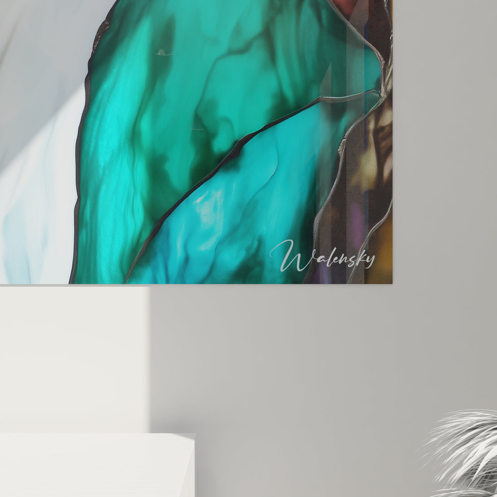 La richesse texturale de cette œuvre est un aspect fondamental de son attrait visuel. Chaque segment coloré présente des variations subtiles de transparence et d'opacité qui suggèrent la profondeur et le mouvement de l'eau. Les surfaces turquoise révèlent des marbrures et des variations tonales qui imitent parfaitement les reflets changeants de l'eau sous différentes lumières.