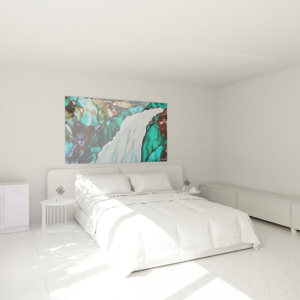 Pour l'éclairage artificiel, privilégiez des spots LED orientables à température de couleur neutre (autour de 4000K) qui mettront en valeur à la fois les tons froids et chauds de l'œuvre. Un mur de couleur neutre, idéalement blanc cassé ou gris très clair, constituera un fond parfait qui laissera l'œuvre s'exprimer pleinement sans compétition visuelle. Dans un intérieur contemporain, ce art mural cascade peut servir de point focal inspirant dans un salon, ou créer une atmosphère apaisante dans une salle de bains luxueuse, établissant un lien visuel avec l'élément eau.