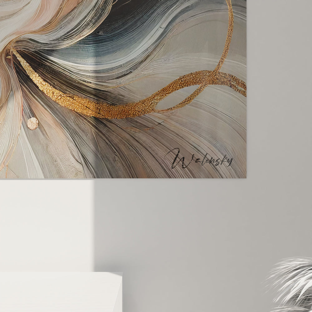 Ce tableau déploie ses courbes sinueuses avec une grâce organique, évoquant un ballet harmonieux d’énergie et de sérénité. Imaginez-vous devant cette pièce où les tons de beige profond se mêlent aux ombres noires, soulignés par des touches dorées qui scintillent délicatement, apportant une chaleur discrète et une luminosité tout en douceur.