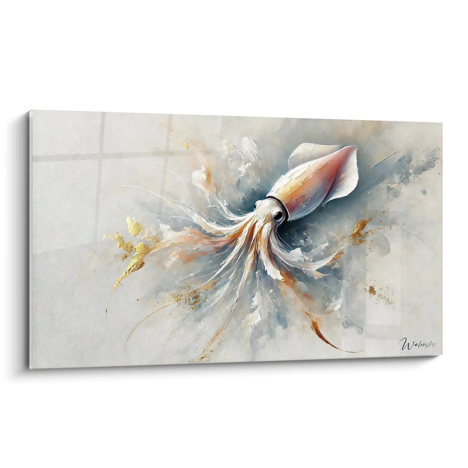Ce tableau incarne l’harmonie parfaite entre légèreté et profondeur. Le calamar géant, majestueux et fluide, semble suspendu dans un ballet silencieux, ses tentacules ondulant au rythme secret des courants marins. Les nuances précieuses de beige, d’or et de blanc caressent vos yeux, apportant à votre pièce une aura paisible et raffinée.