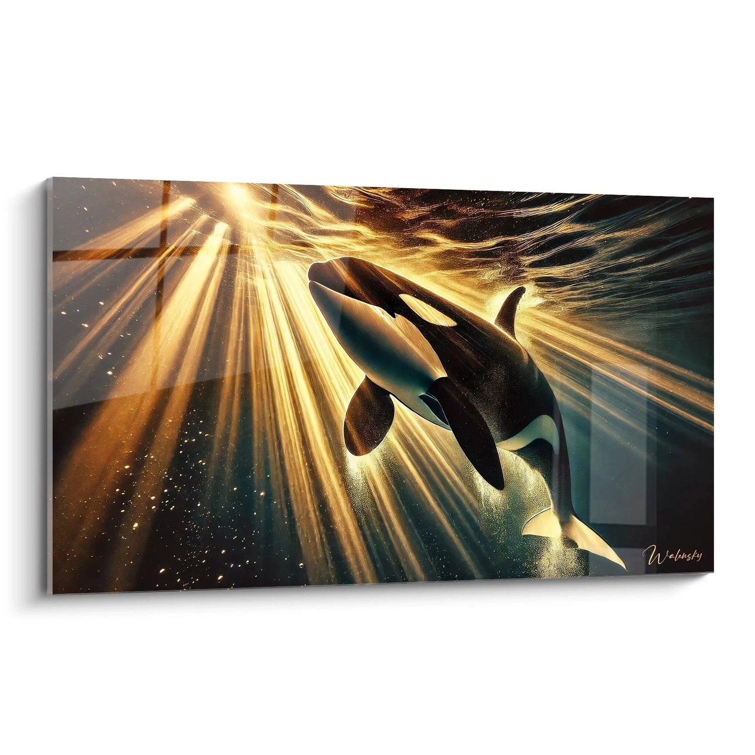 Laissez-vous emporter par la magie du Tableau Fluide et en Lumière - Édition Orque Animaux, une œuvre où la majesté de l’orque se révèle sous un éclat doré intemporel. Ce tableau est bien plus qu’un simple décor : c’est une invitation à plonger dans un univers où la nature et la lumière s’unissent pour insuffler calme et puissance à votre espace.