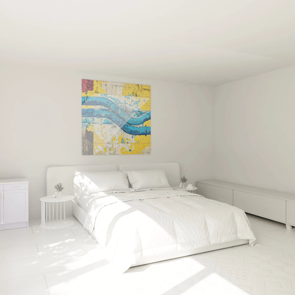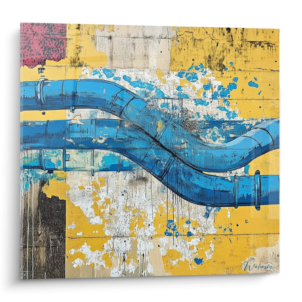 Ce tableau tuyauterie urbaine captive immédiatement par sa composition dynamique centrée sur un système de canalisations bleues sinueuses traversant un fond texturé jaune et blanc. L'œuvre présente un contraste saisissant entre les lignes fluides des conduites et la rugosité du mur urbain représenté. Les éclaboussures bleues suggèrent une fuite ou un écoulement, créant une sensation de mouvement et d'énergie. Ce tableau conduite industrielle transforme un élément utilitaire en sujet artistique vibrant.