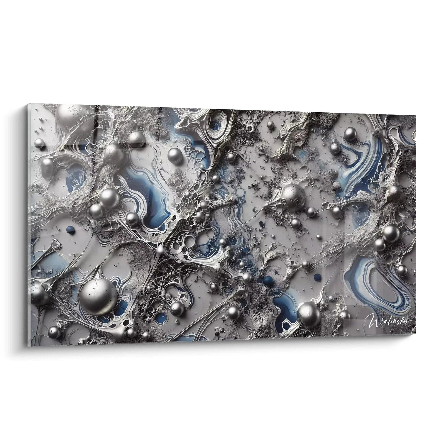 Chaque regard posé sur cette création révèle un monde en perpétuel flux : des sphères argentées qui scintillent comme des étoiles lointaines, des courbes délicates semblables à des galaxies en formation. La technique epoxy donne à l’ensemble un relief sophistiqué, presque tactile, qui capte et joue avec la lumière pour offrir un spectacle changeant selon la perspective.