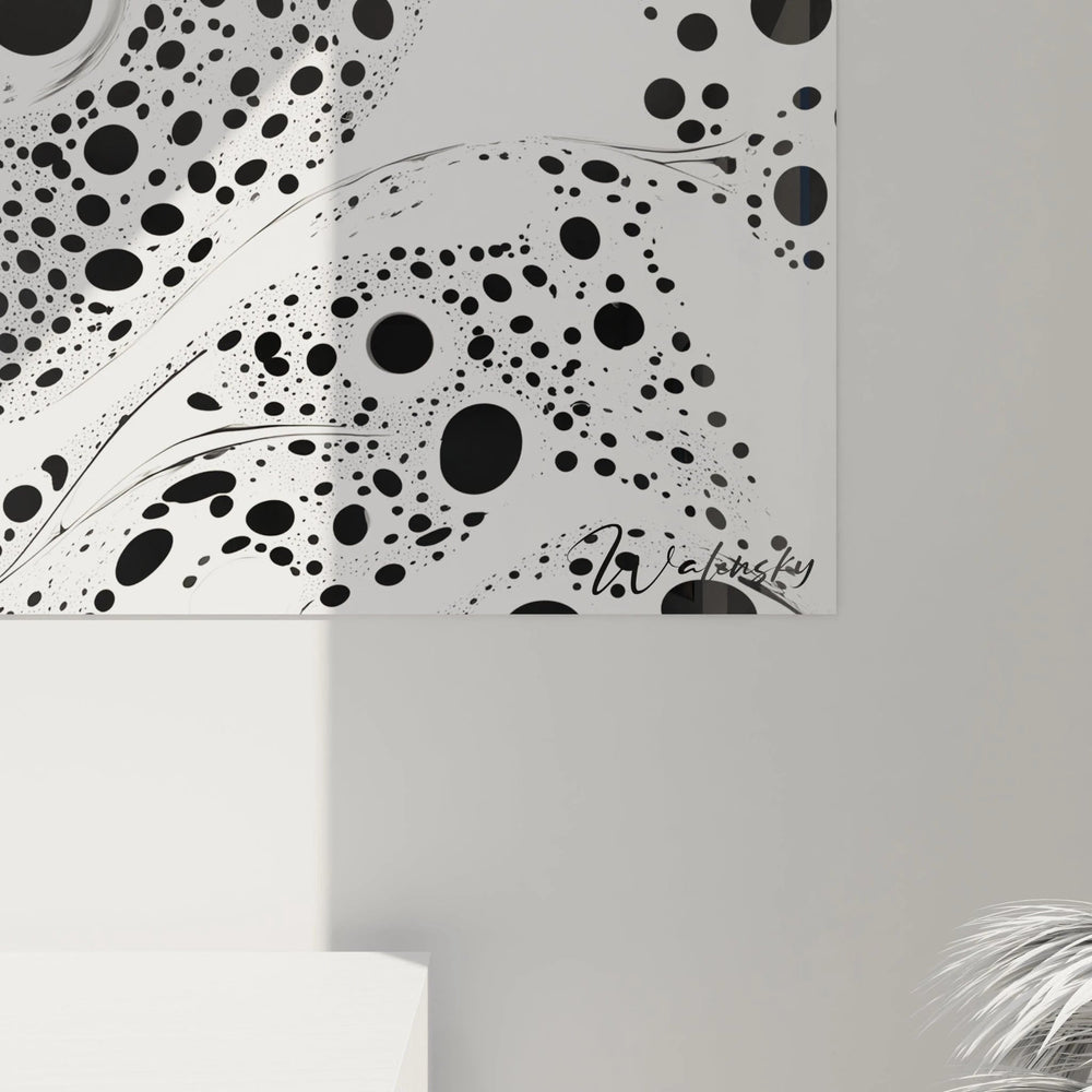 Ce tableau abstrait fluide révèle une composition fascinante où des formes organiques serpentent à travers un univers ponctué de cercles noirs et blancs. L'œuvre présente un contraste saisissant entre les zones denses parsemées de points de différentes tailles et les espaces blancs plus épurés. Les tableau abstrait organique noir blanc crée immédiatement une sensation de mouvement perpétuel, évoquant tantôt des galaxies lointaines, tantôt des organismes microscopiques en pleine danse. Cette décoration murale abstraite fluide capture l'attention par ses courbes sinueuses qui guident naturellement le regard à travers toute la composition, créant une expérience visuelle hypnotique et méditative.