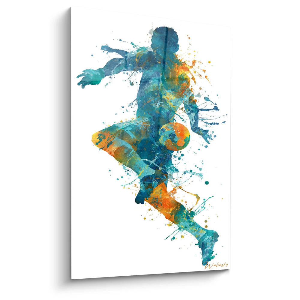 Ce tableau moderne présente une fusion artistique saisissante entre le football et le skateboard, créant une œuvre unique qui transcende les frontières sportives. L'artiste a capturé un footballeur en pleine action de skateboard, utilisant une technique d'aquarelle éclaboussée qui donne vie au mouvement et à l'énergie de la scène. Les projections de peinture et les éclaboussures colorées renforcent l'aspect dynamique de cette création, évoquant la spontanéité et la créativité du street art. Cette représentation artistique du sport urbain s'adresse aux passionnés de football qui apprécient également l'univers du skateboard et de la culture urbaine. Le style graphique moderne et les couleurs vives en font une pièce décorative parfaite pour les espaces contemporains, chambres d'adolescents, salles de sport ou bureaux créatifs.