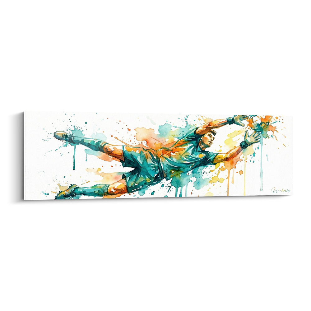 Cette œuvre d'art moderne capture l'intensité du football à travers un tacle spectaculaire représenté dans un style aquarelle contemporain. Le footballeur, figé dans un mouvement dynamique, s'élève dans les airs avec une grâce athlétique saisissante. L'artiste a su transcrire toute l'énergie et la passion du football dans cette composition horizontale qui s'étend majestueusement sur la toile. Les éclaboussures et coulures de peinture créent un effet de mouvement qui amplifie la sensation de vitesse et d'impact du geste sportif. Ce tableau football moderne transforme un simple tacle en véritable ballet aérien, célébrant la beauté du sport roi. L'œuvre s'impose comme une pièce maîtresse pour tout amateur de football et d'art contemporain, apportant une dimension artistique raffinée à la décoration intérieure.