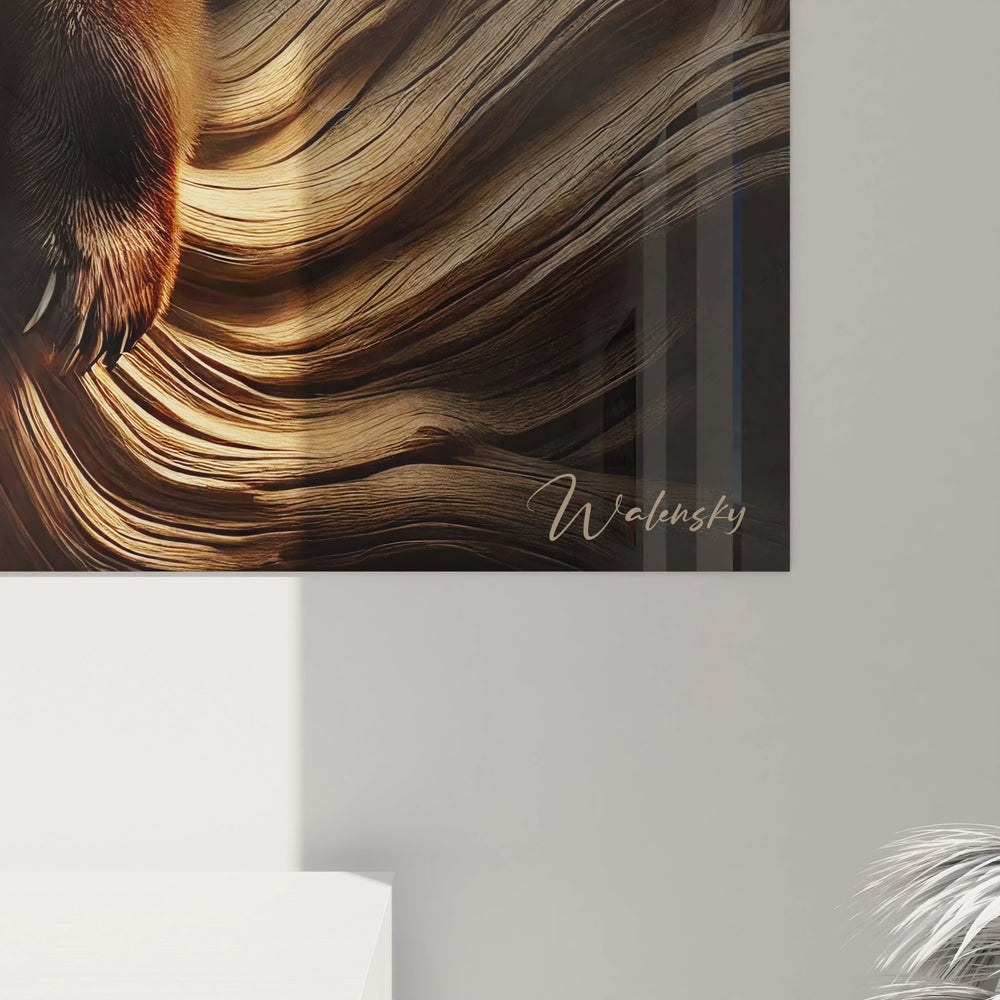 Chaque détail de ce tableau invite au calme. Les textures vivantes du bois entrelacé en arrière-plan apportent une sensation tactile presque palpable, évoquant la résilience et la beauté brutale des paysages forestiers. Ce contraste entre la douceur épaisse de la fourrure du grizzly et la robustesse du bois crée une ambiance à la fois chaleureuse et pleine d’énergie contenue. C’est une véritable incitation à ralentir, à ressentir chaque instant et à se connecter avec l’essentiel.