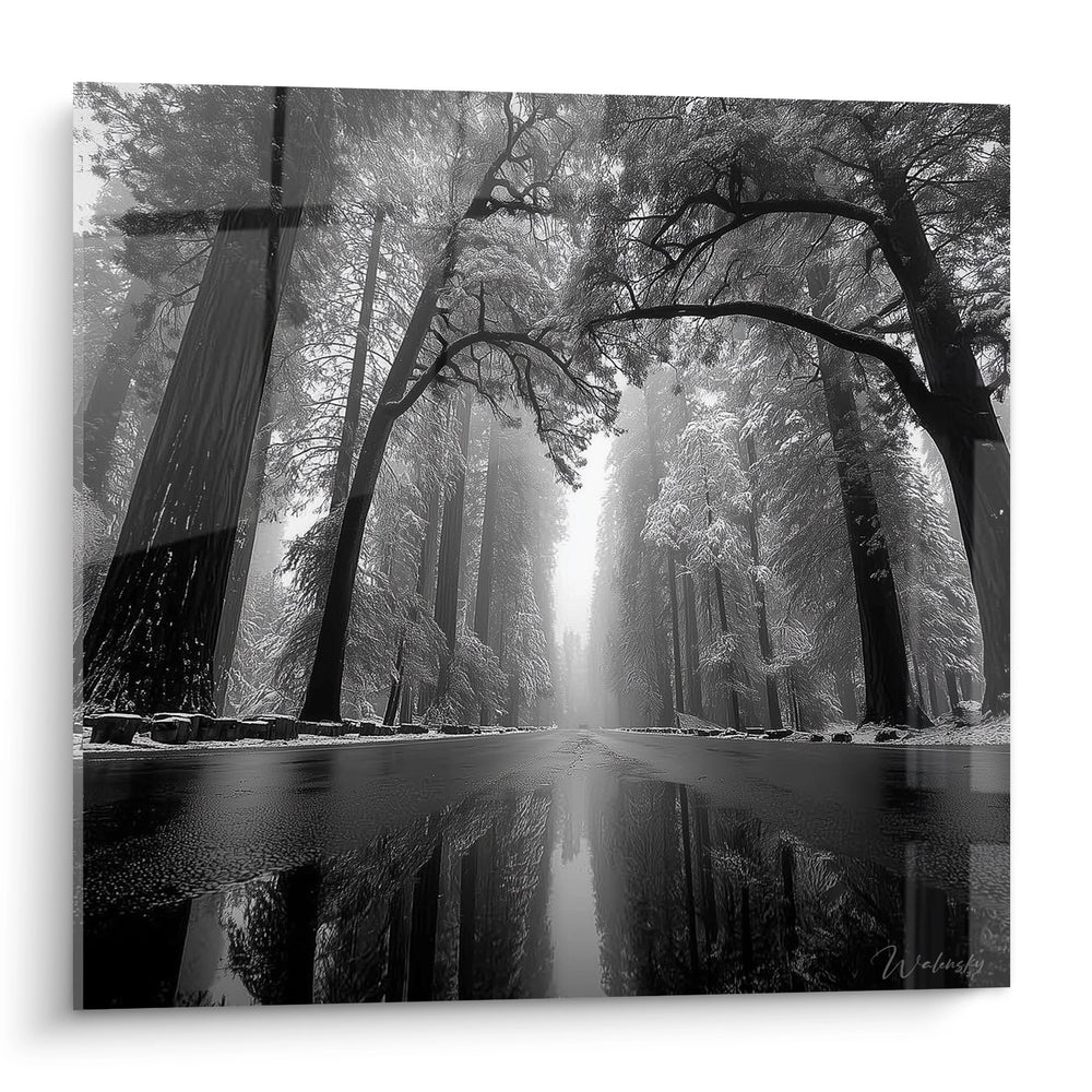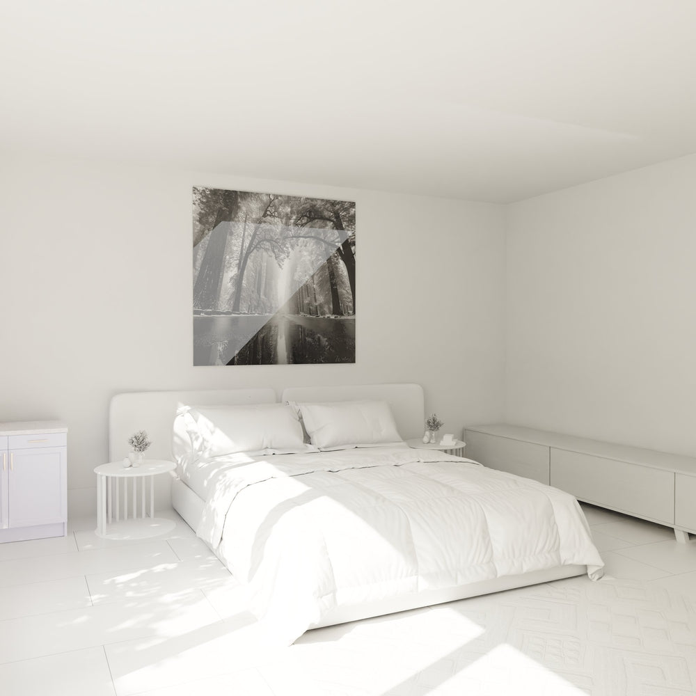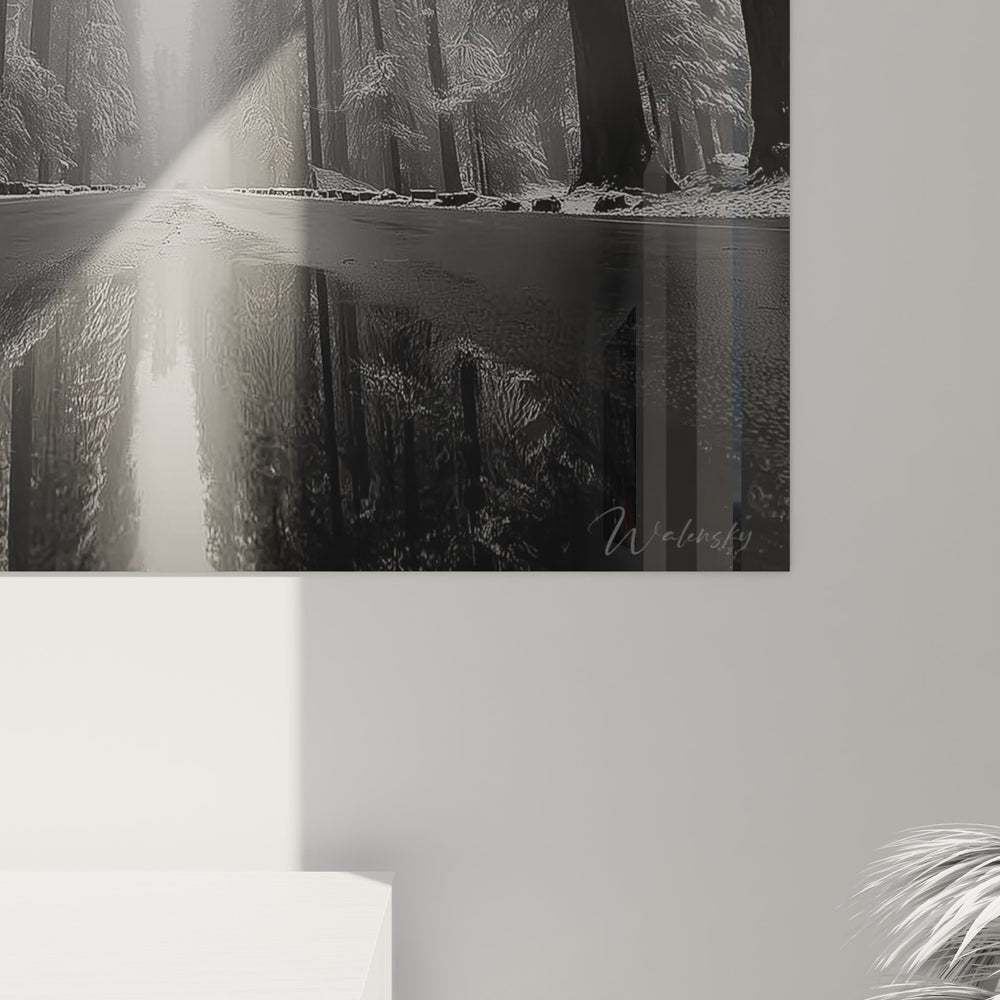 Cette œuvre s'inscrit dans la tradition de la photographie de paysage contemplative, rappelant les travaux d'Ansel Adams pour sa maîtrise du noir et blanc naturel. L'approche artistique évoque également les peintures romantiques du XIXe siècle, où la nature brumeuse exprimait le sublime et l'émotion. Cette décoration intérieure nature s'harmonise parfaitement avec les styles contemporains et zen.