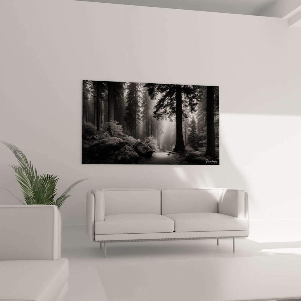 Tags : tableau forêt, décoration nature, art noir et blanc, paysage mystérieux, photographie forestière