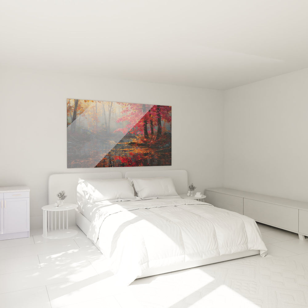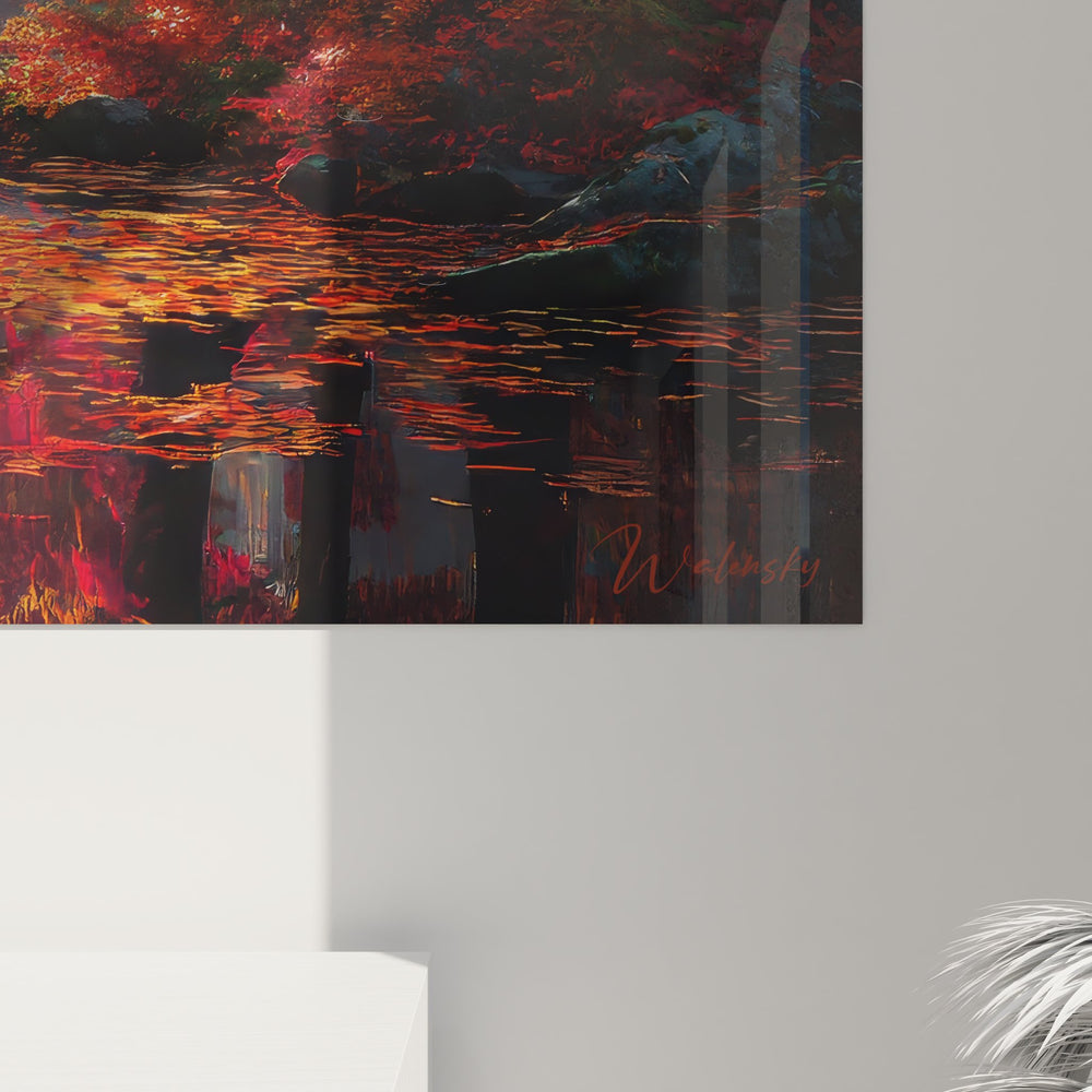 La palette chromatique riche de cette œuvre évoque la transition saisonnière et le cycle éternel de la nature. Les rouges écarlates et les dorés lumineux symbolisent la transformation et la maturité, tandis que les reflets aquatiques représentent la permanence et la sérénité. Cette harmonie colorée nature crée une ambiance apaisante parfaite pour la décoration intérieure contemporaine.